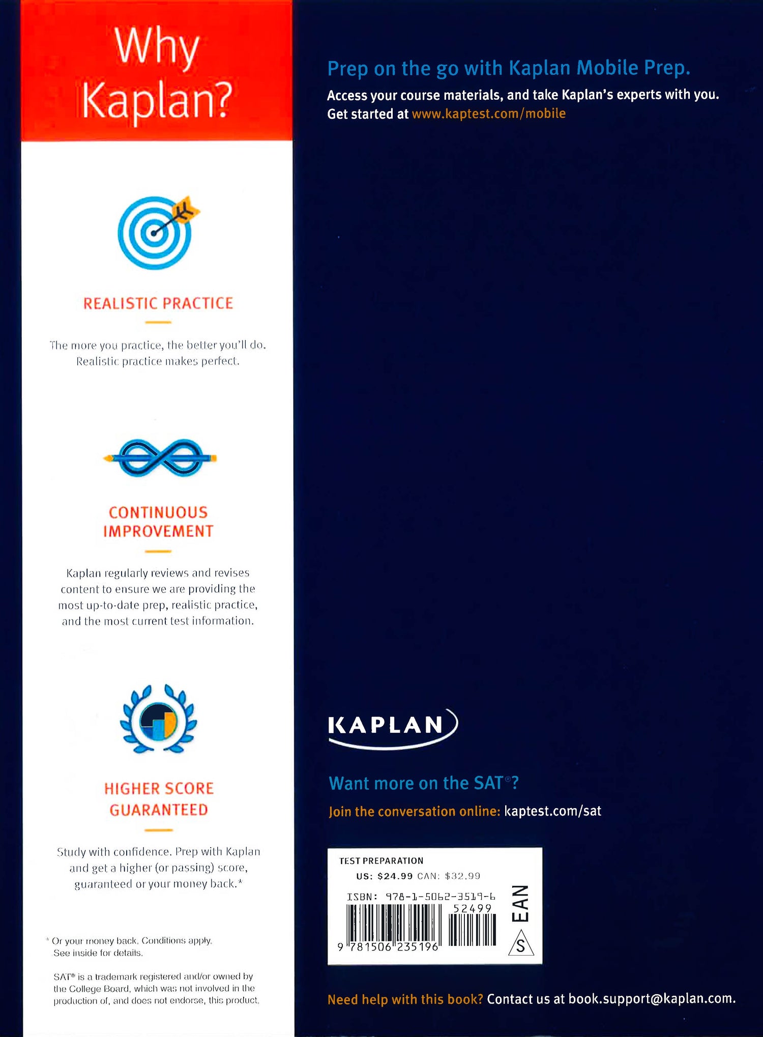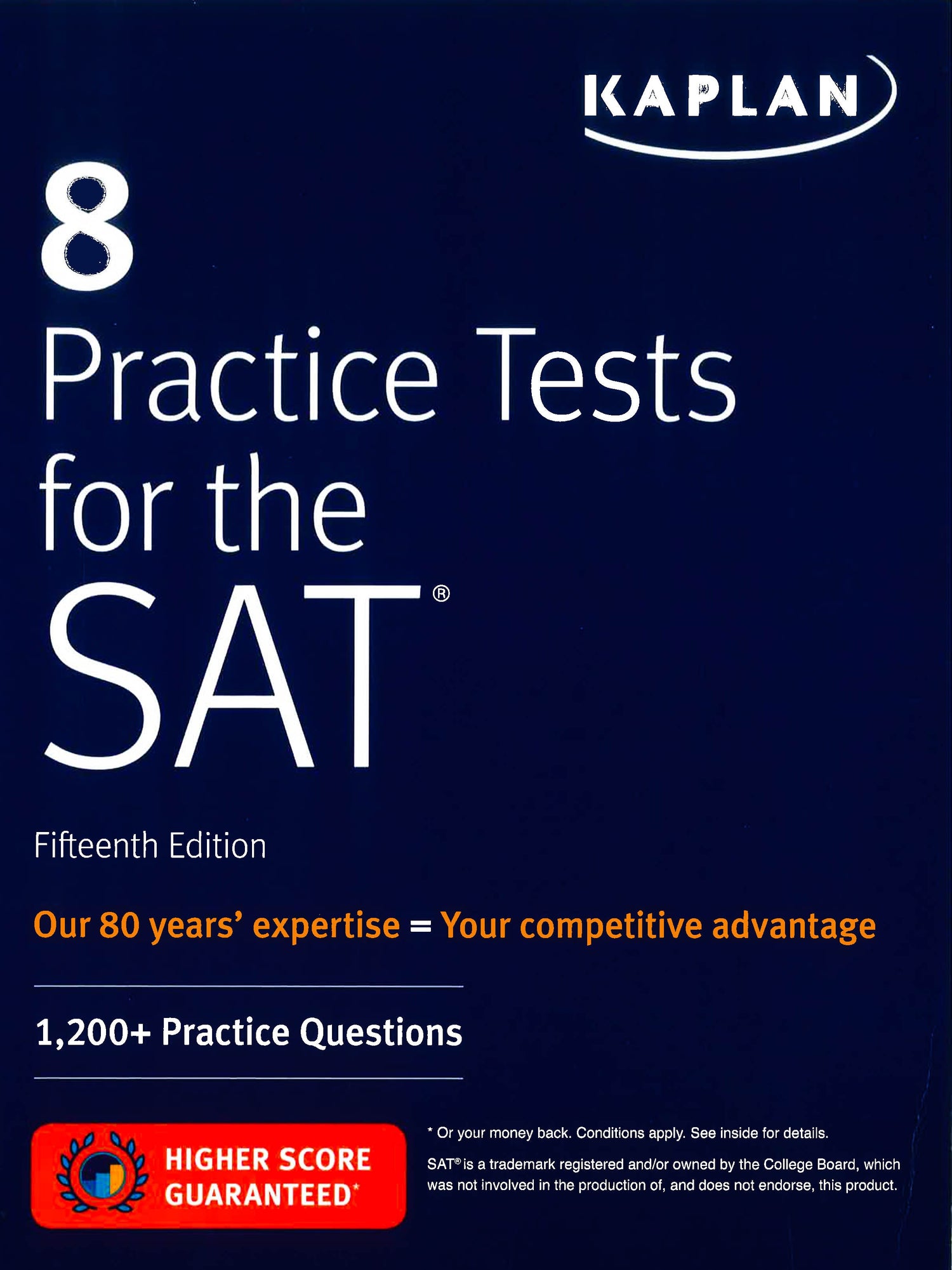 Kaplan's 8 Practice Tests for the SAT provides printed practice exams and expert explanations to help you face the SAT with confidence. More than 1,200 realistic practice questions help you get comfortable with the exam format so you can avoid surprises on Test Day.We are so certain that 8 Practice Tests for the SAT offers the practice you need that we guarantee it: After studying with our book, you'll score higher on the SAT-or you'll get your money back.The Most PracticeEight realistic full-length practice testsMore than 1,200 practice questions help you increase speed and accuracy with all the different SAT question types More than 450 Math Grid-Ins and Multiple-Choice questionsMore than 400 Evidence-Based Reading questionsMore than 350 Writing and Language questionsEight Essay Prompts, complete with model essays and a self-grading guideDetailed answer explanations written by our experts help you determine your strengths and weaknesses and improve your performance.Expert Guidance9 out of 10 Kaplan students get into one or more of their top choice collegeWe know the test: Our experts have put tens of thousands of hours into studying the SAT - using real data to design the most effective strategies and study materials.We invented test prep. Kaplan has been helping students achieve their goals for over 80 years. Learn more at kaptest.com.
