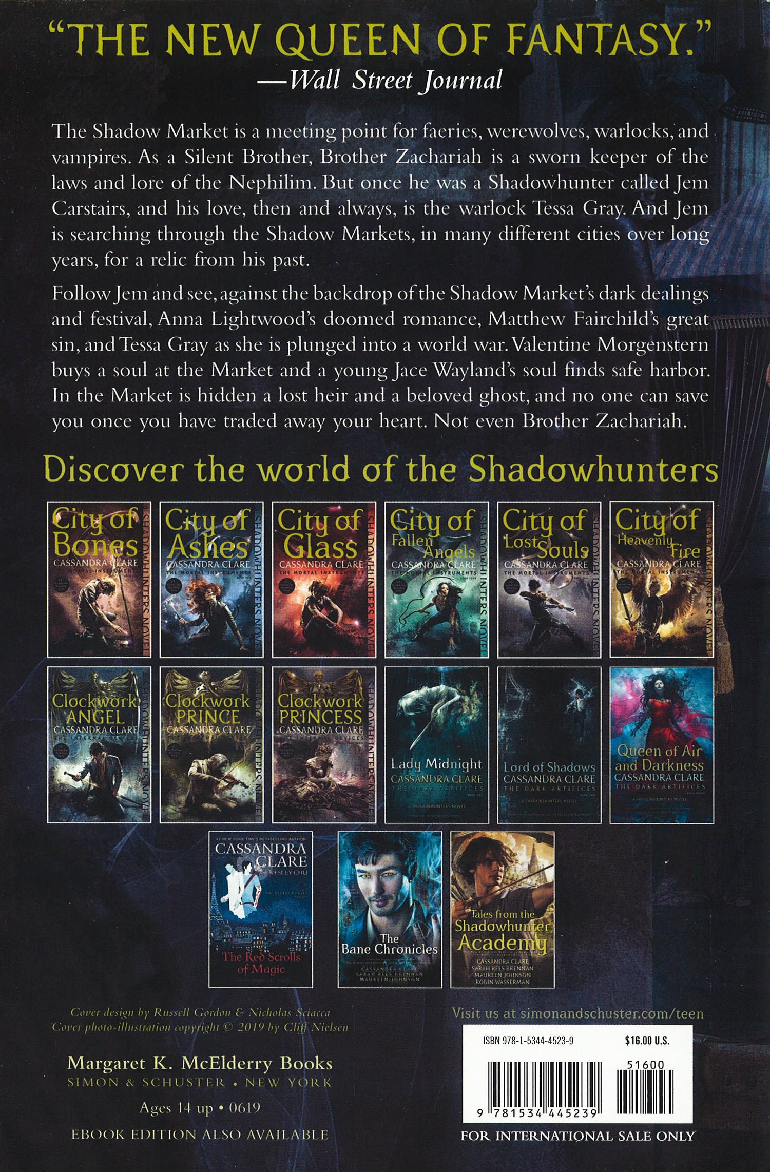 From New York Times and USA TODAY bestselling author Cassandra Clare comes an exciting new short story collection that follows Jem Carstairs as he travels through the many Shadow Markets around the world. Ghosts of the Shadow Market is a Shadowhunters novel. The Shadow Market is a meeting point for faeries, werewolves, warlocks, and vampires. There, the Downworlders buy and sell magical objects, make dark bargains, and whisper secrets they do not want the Nephilim to know. Through two centuries, however, there has been a frequent visitor to the Shadow Market from the City of Bones, the very heart of the Shadowhunters' world. As a Silent Brother, Brother Zachariah is a sworn keeper of the laws and lore of the Nephilim. But once he was a Shadowhunter called Jem Carstairs, and his love, then and always, is the warlock Tessa Gray. And Jem is searching through the Shadow Markets, in many different cities over long years, for a relic from his past. Follow Jem and see, against the backdrop of the Shadow Market's dark dealings and festival, Anna Lightwood's doomed romance, Matthew Fairchild's great sin, and Tessa Gray as she is plunged into a world war. Valentine Morgenstern buys a soul at the Market and a young Jace Wayland's soul finds safe harbor. In the Market is hidden a lost heir and a beloved ghost, and no one can save you once you have traded away your heart. Not even Brother Zachariah.