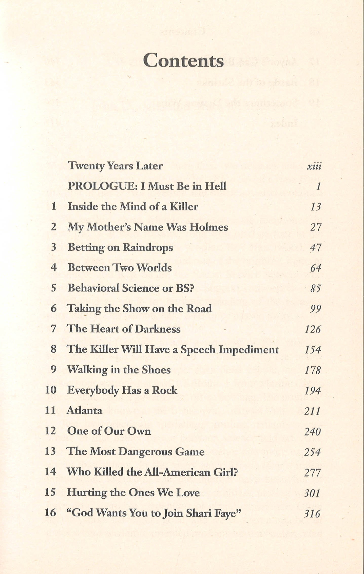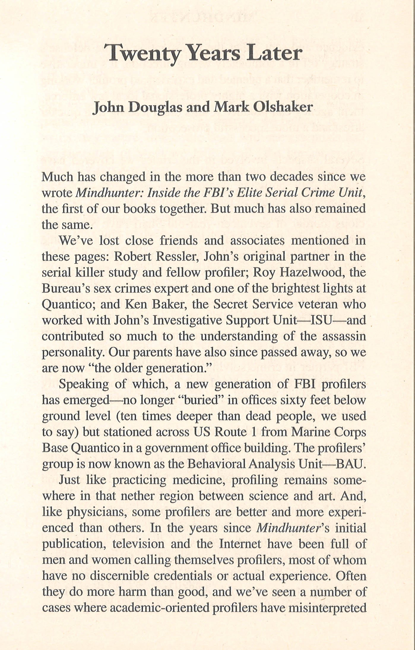 Douglas invented and established the practice of criminal profiling, and submerged himself in the world of serial killers in a quest to understand why they killed, and to help prevent more innocent lives from being ended by future killers. As his serial crime unit developed from a derided two-bit operation in a dingy officer to one of the FBI's elite task forces, Douglas personally confronted the most terrible crimes of the age, including those of Jeffrey Dahmer, Charles Manson, Ted Bundy and the Atlanta child murderer.