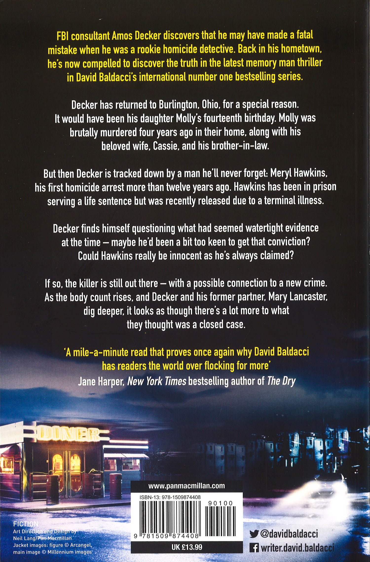 FBI Special Agent Amos Decker discovers that a mistake he made as a rookie detective may have led to deadly consequences in the latest Memory Man thriller in David Baldacci's number one New York Times bestselling series. Amos Decker and his FBI partner Alex Jamison are visiting his hometown of Burlington, Ohio, when he's approached by an unfamiliar man. But he instantly recognizes the man's name: Meryl Hawkins. He's the first person Decker ever arrested for murder back when he was a young detective. Though a dozen years in prison have left Hawkins unrecognizably aged and terminally ill, one thing hasn't changed: He maintains he never committed the murders. Could it be possible that Decker made a mistake all those years ago? As he starts digging into the old case, Decker finds a startling connection to a new crime that he may be able to prevent, if only he can put the pieces together quickly enough...