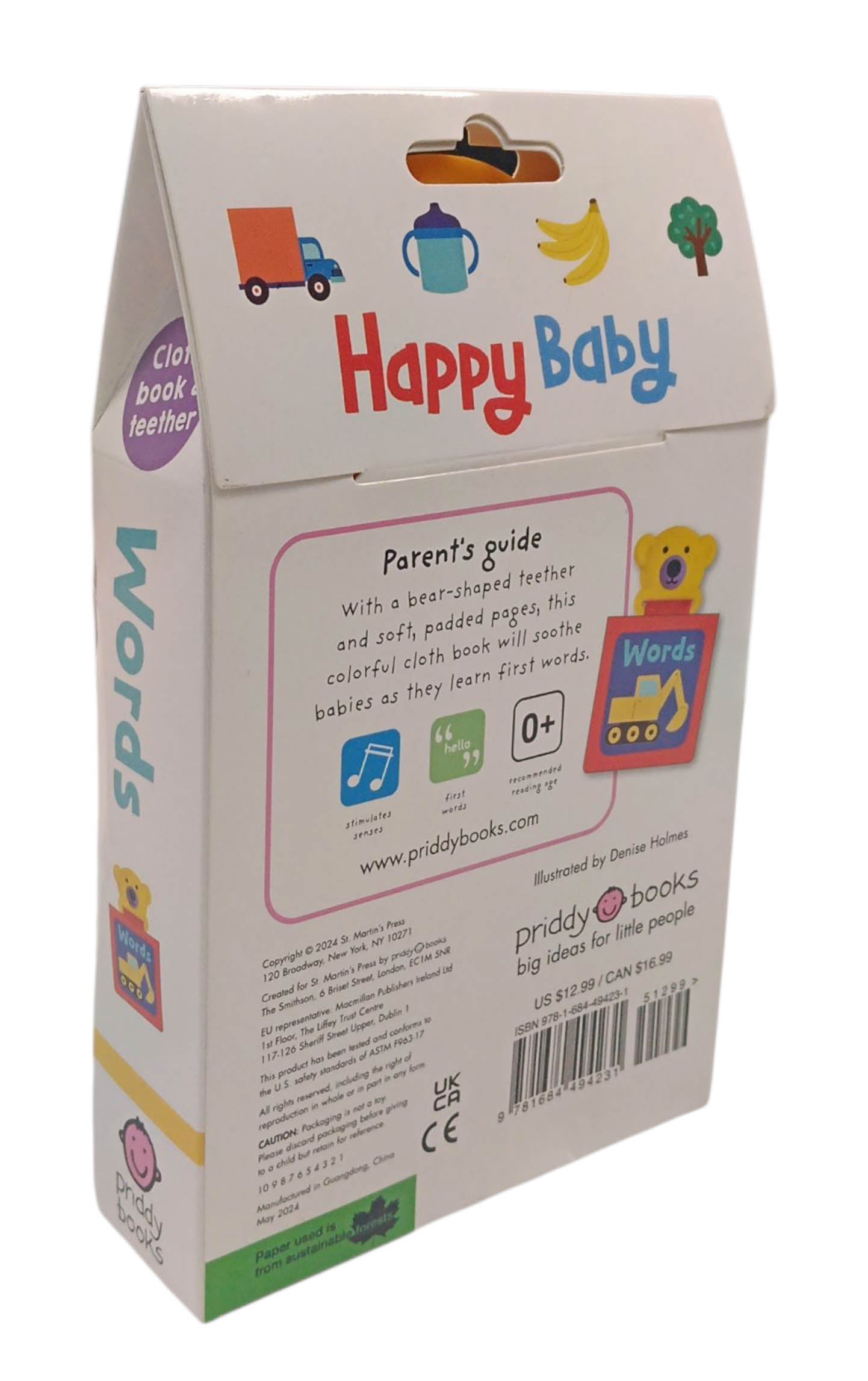 Babies will love learning new words with Happy Baby: Words, a super-soft cloth and teether book by Priddy Books.