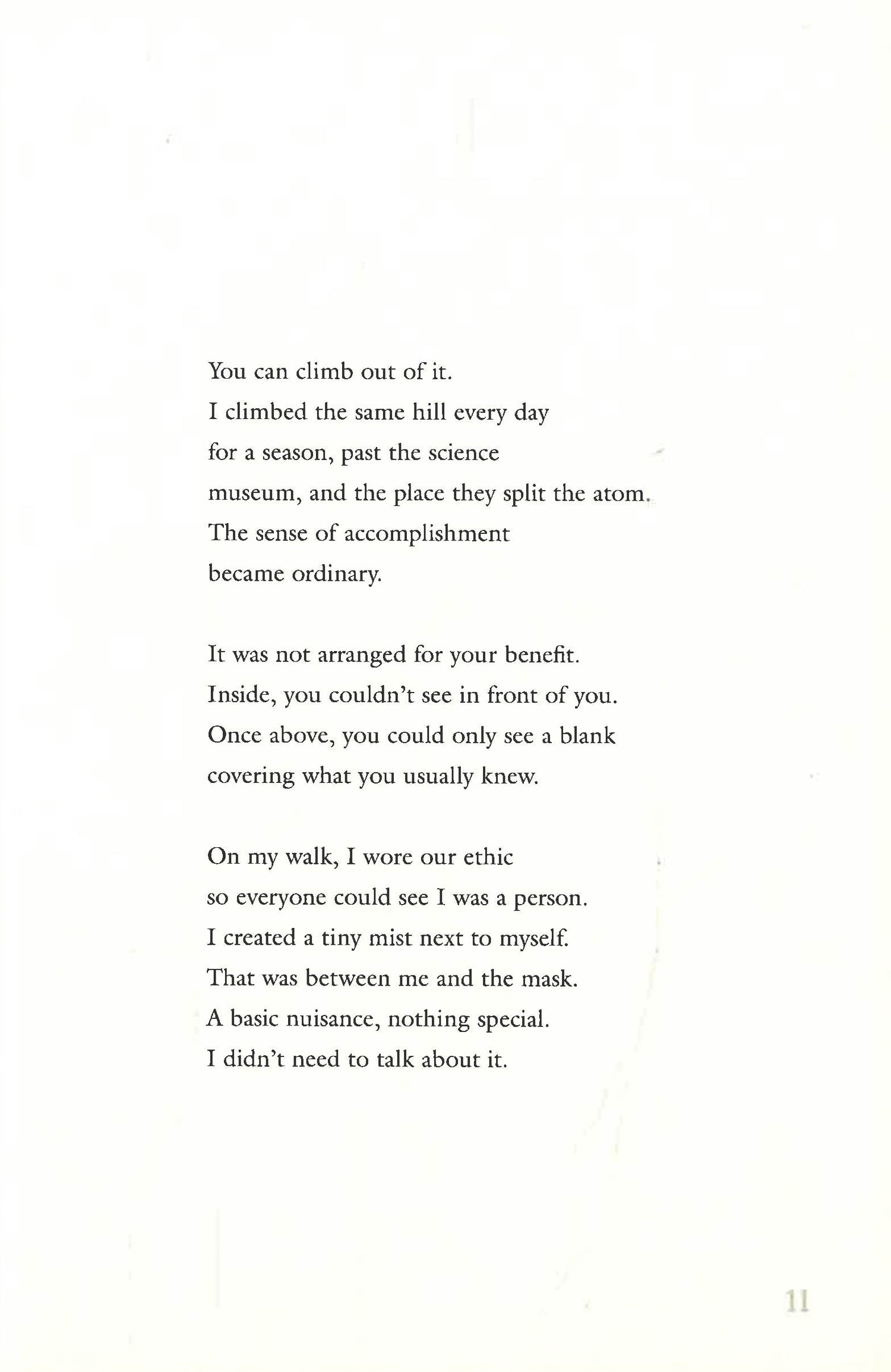 The collection moves through three sections: First, the poet follows her local fog’s cyclical journey of descent and dispersion. Second, in a sort of pastoral interlude, she travels widely, almost erratically, to the California desert, the greater world, and ancient history. Finally, she descends into the enclosed space of the household, and the increased confinement and intimacy of raising a child during the pandemic. Peterson unfolds the small moments that make up our lives and reveals the truths contained within them, and her poems capture the lyricism of our daily rhythms―the interruptions, dialogues, and epiphanies.
