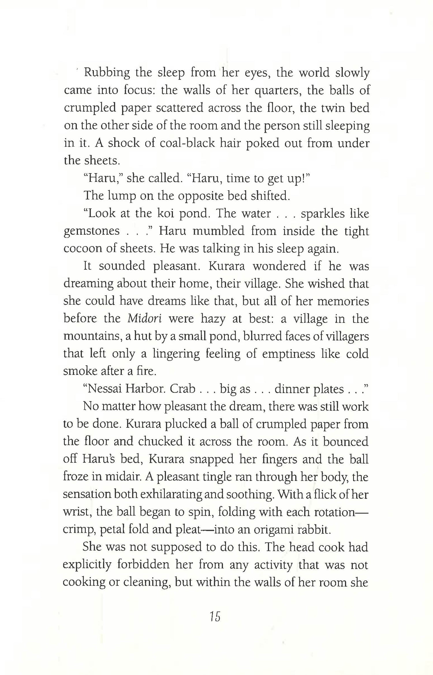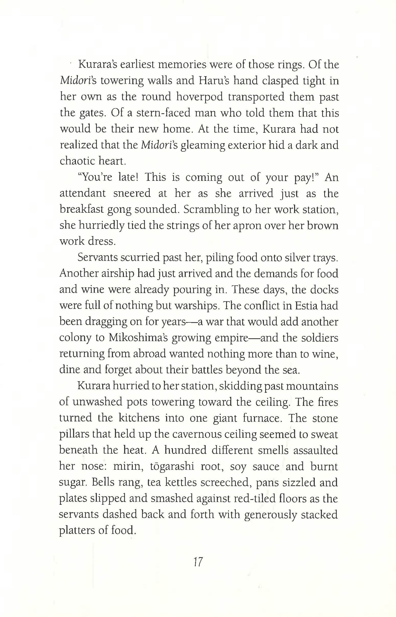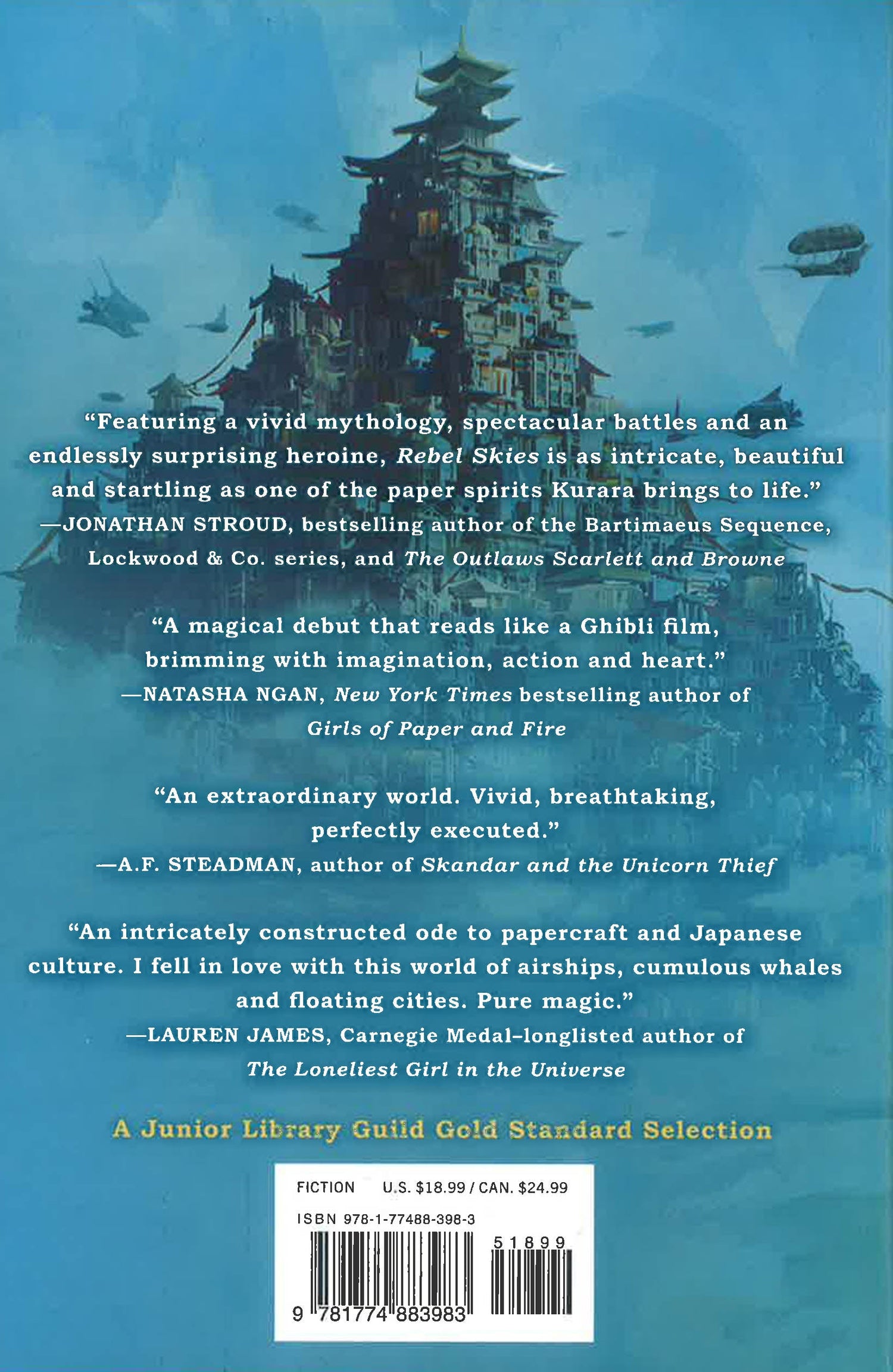 Kurara has never known any other life than being a servant onboard the Midori, a flying ship serving the military elite of the Mikoshiman Empire, a vast realm of floating cities. Kurara also has a secret — she can make folded paper figures come to life with a flick of her finger. But when the Midori is attacked and Kurara's secret turns out to be a power treasured across the empire, a gut-wrenching escape leads her to the gruff Himura, who takes her under his wing. Under Himura's tutelage, and with the grudging support and friendship of his crew, Kurara learns to hunt shikigami — wild paper spirits sought after by the Princess of Mikoshima.