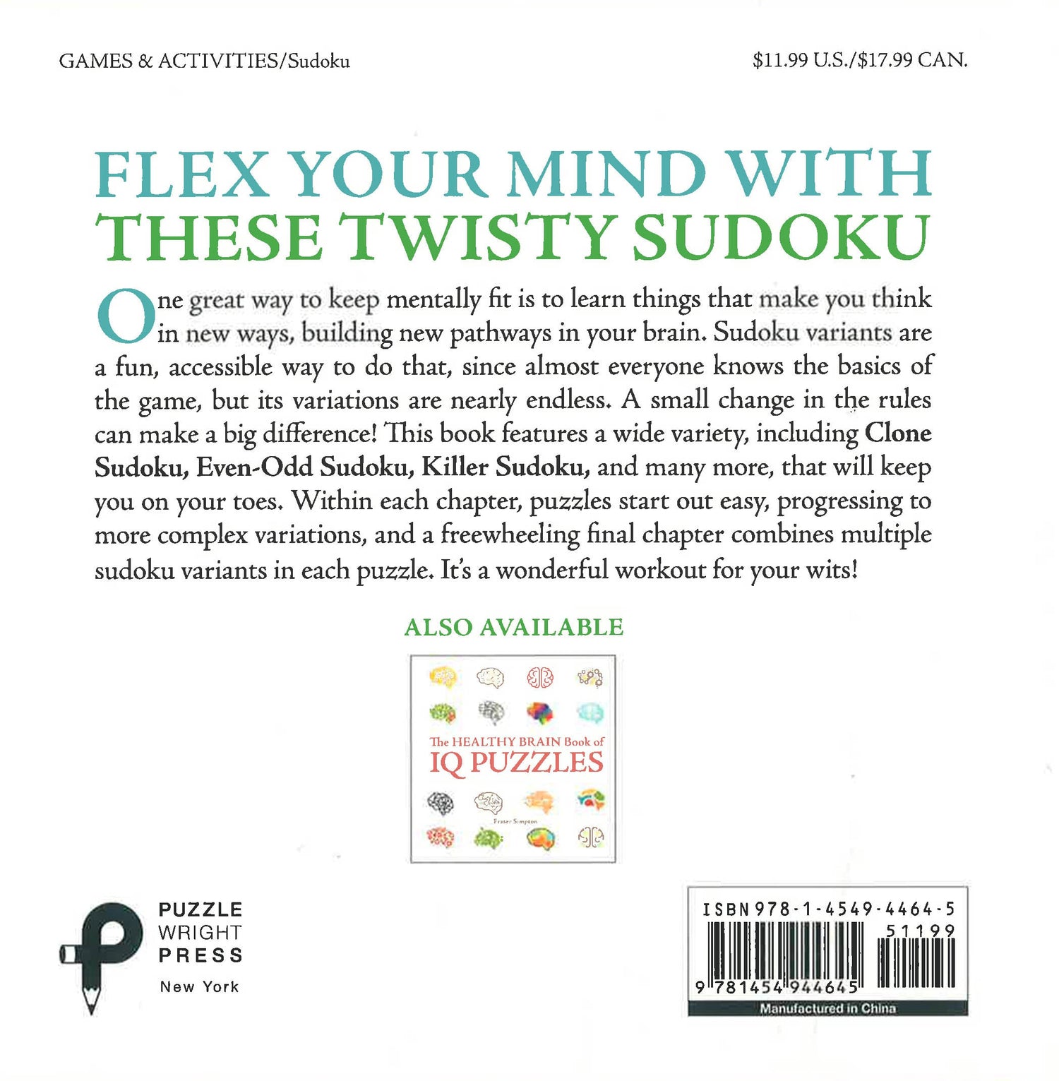 Research has shown that a great way to keep your memory and cognitive skills at their best is to learn challenging new things that require you to think. That book offers an accessible way to do just that, since almost everyone knows the basics of solving sudoku, but its variations are nearly endless, and just a small change in the rules can make a big difference in the solving experience. This book features a wide variety of sudoku variants (like Clone Sudoku, Even-Odd Sudoku, Killer Sudoku, and many more), designed to keep solvers on their toes, but presented accessibly, with easier puzzles leading into more complex variations. A freewheeling final chapter combines multiple variations in each puzzle.