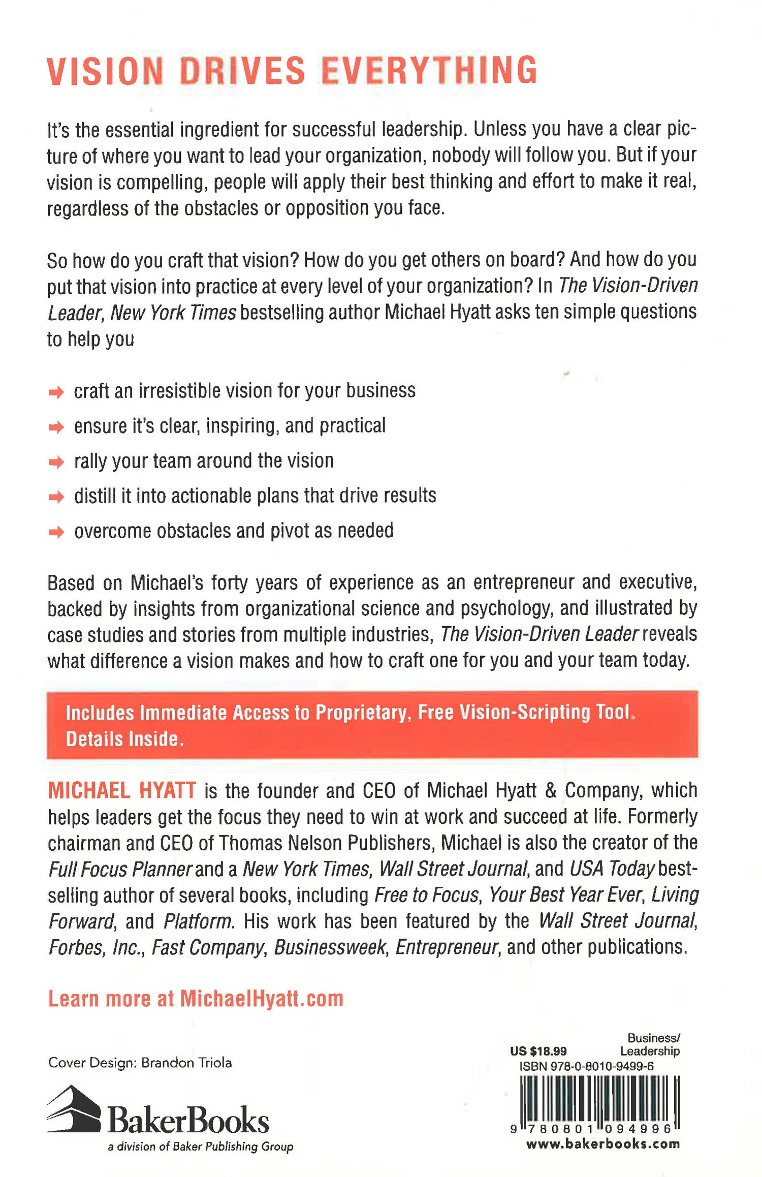 Having a clear, compelling vision--and getting buy-in from your team--is essential to effective leadership. If you don't know where you're going, how on earth will you get there? But how do you craft that vision? How do you get others on board? And how do you put that vision into practice at every level of your organization? In The Vision-Driven Leader, New York Times bestselling author Michael Hyatt offers six tools for crafting an irresistible vision for your business, rallying your team around the vision, and distilling it into actionable plans that drive results. Based on Michael's 40 years of experience as an entrepreneur and executive, backed by insights from organizational science and psychology, and illustrated by case studies and stories from multiple industries, The Vision-Driven Leader takes you step-by-step from why to what and then how. Your business will never be the same.