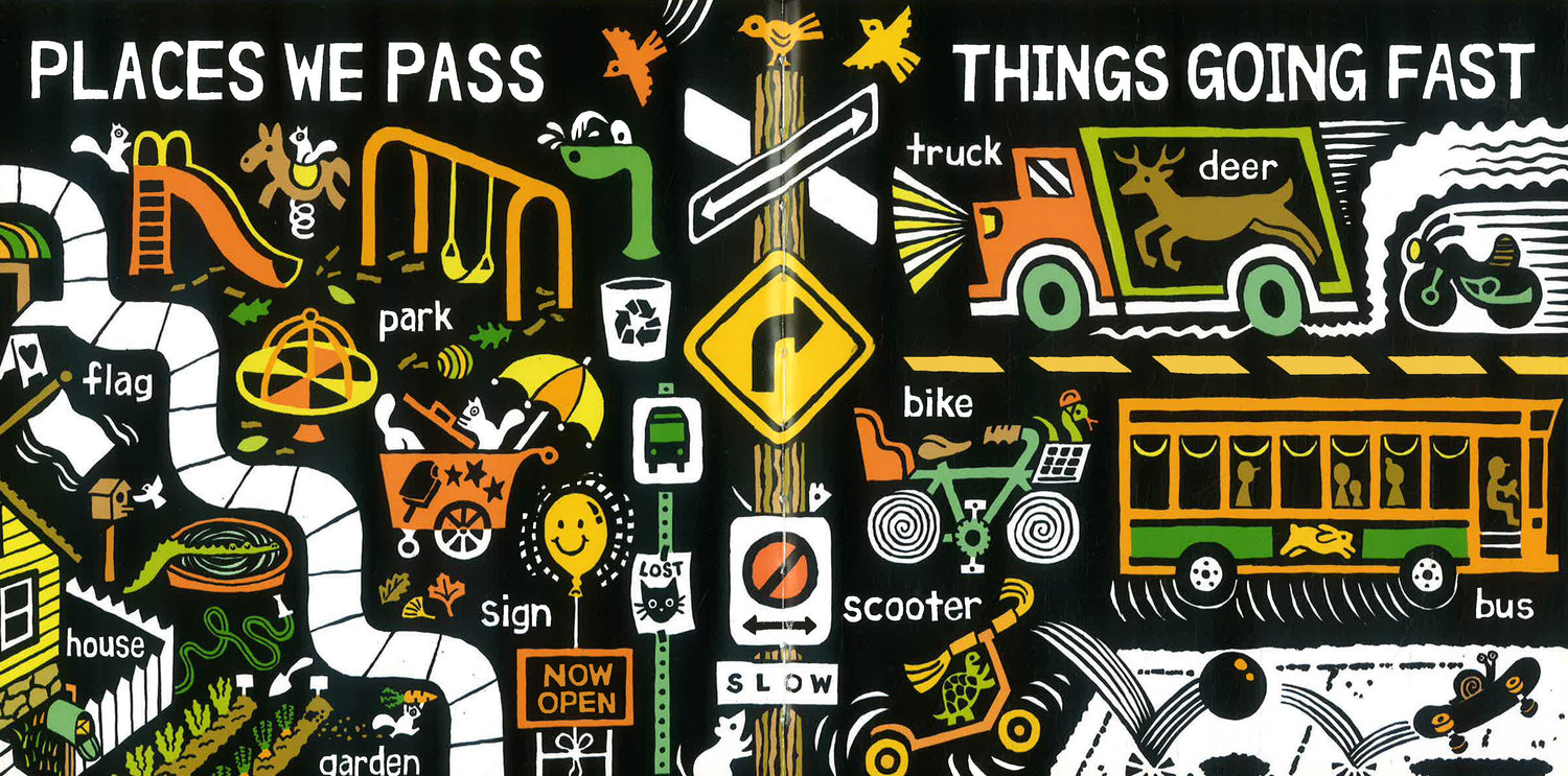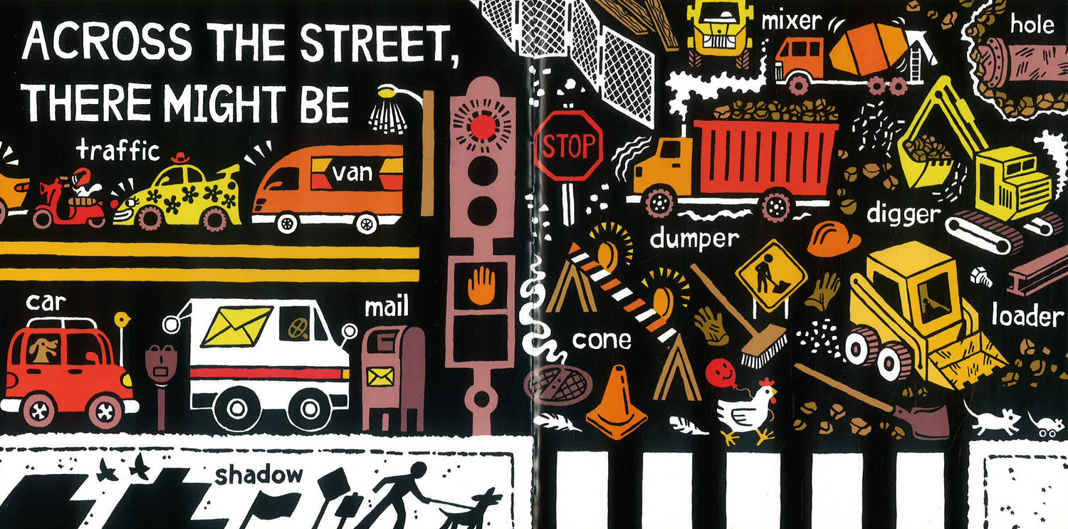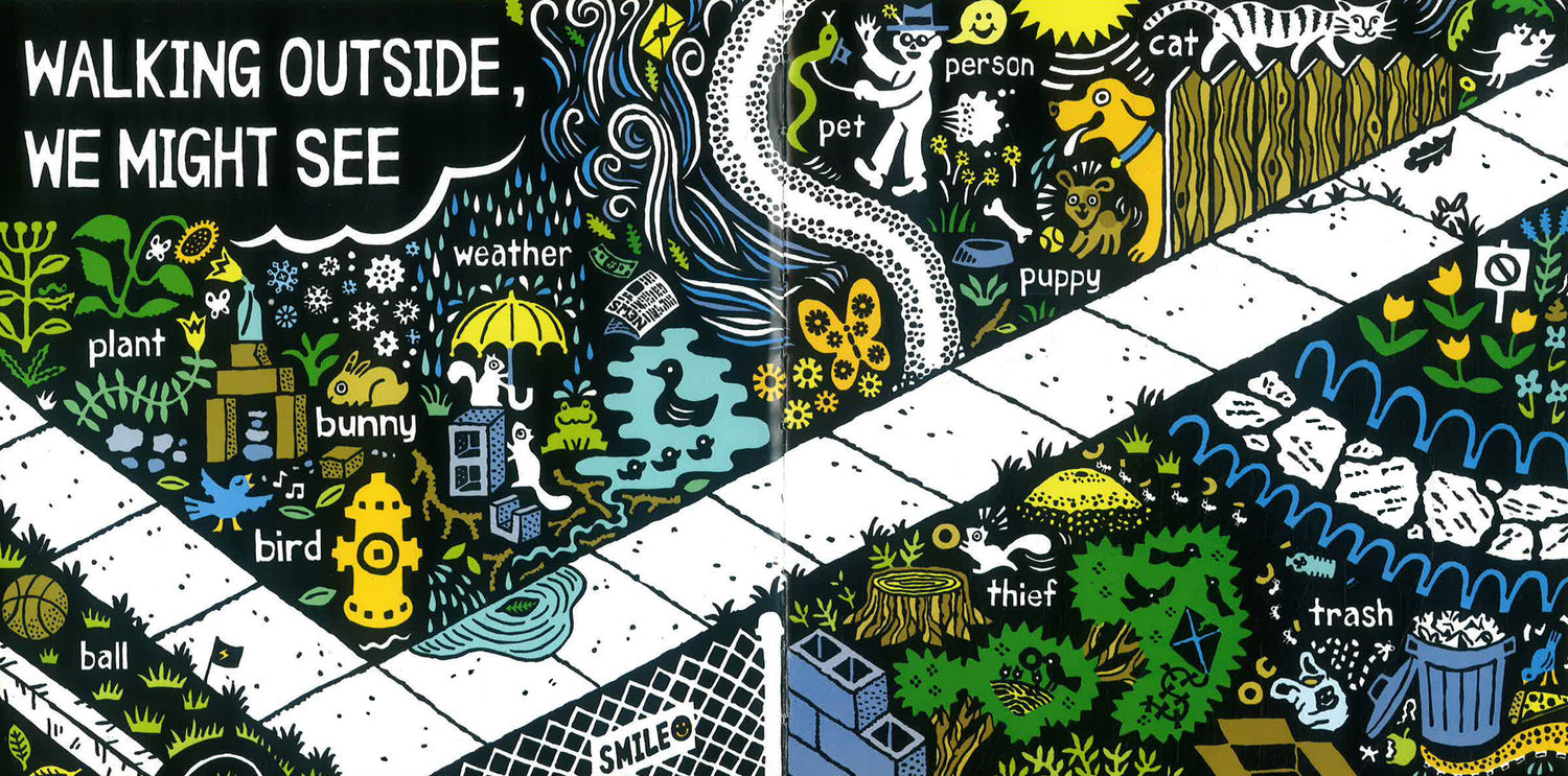 In the tradition of Richard Scarry, this cleverly conceived first-words picture book is sure to satisfy the youngest readersWalking outside, we might seePlaces we pass, things going fastAcross the street, there might beSounds in our ears, music to hearAgainst this lively rhyming narrative text, readers will find a splash of first words on each spread, inviting little ones to identify things they might see in their own backyards. And some unexpected things, too! Spreads are thoughtfully organized to give readers time with different types of words. One spread is full of onomatopoeia. Another full of color words. Another still invites readers to think about scale―big things and small ones. The high-contrast art is married beautifully with lots of detail on each page, giving the youngest readers lots to find and a friendly environment in which to discover something new on every read.