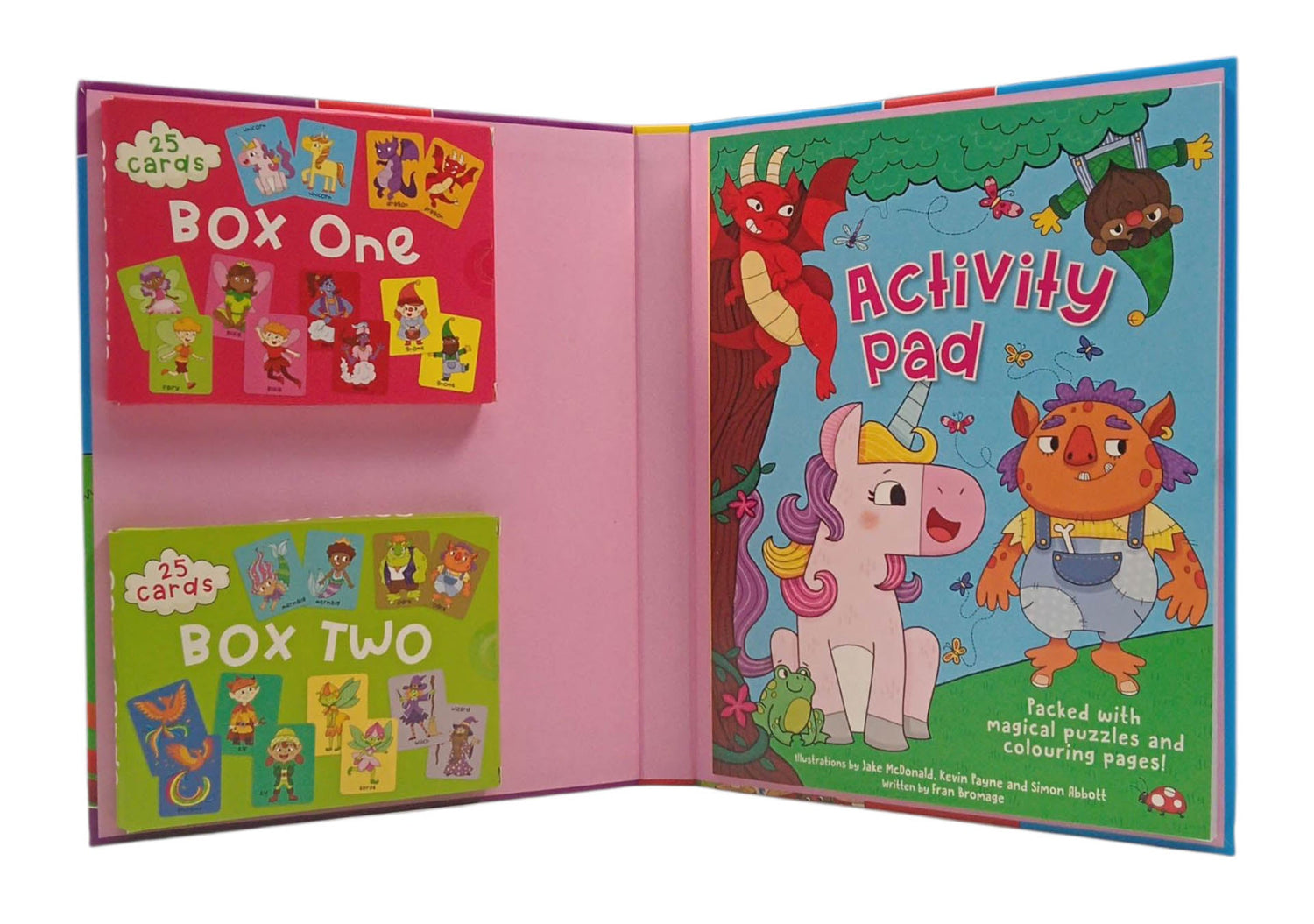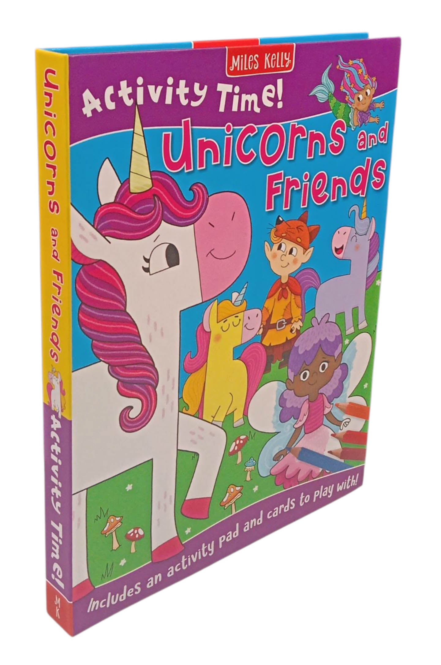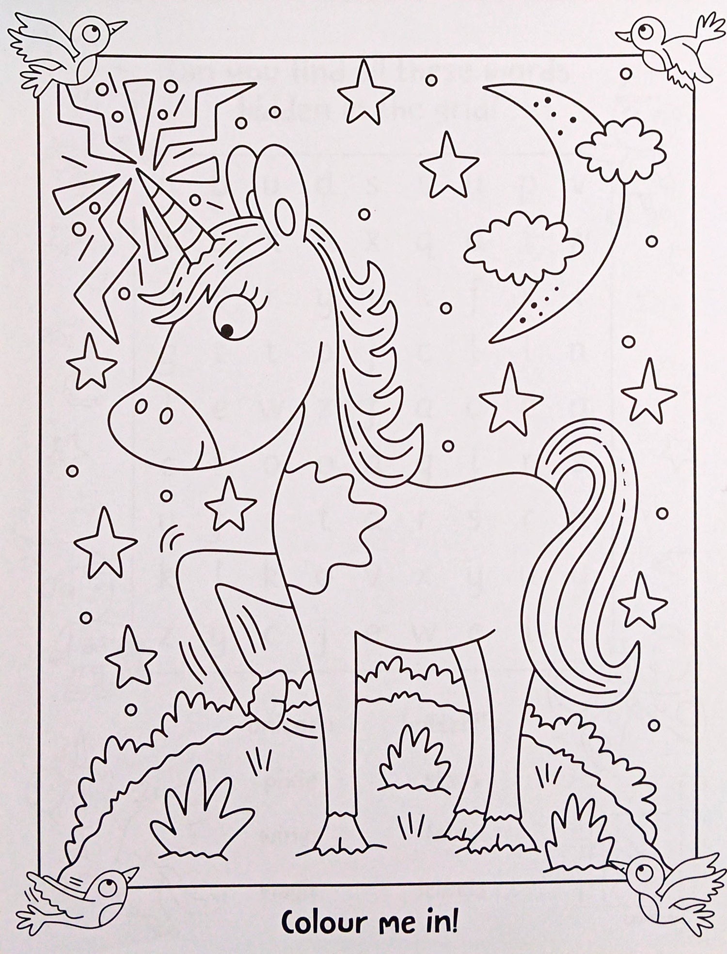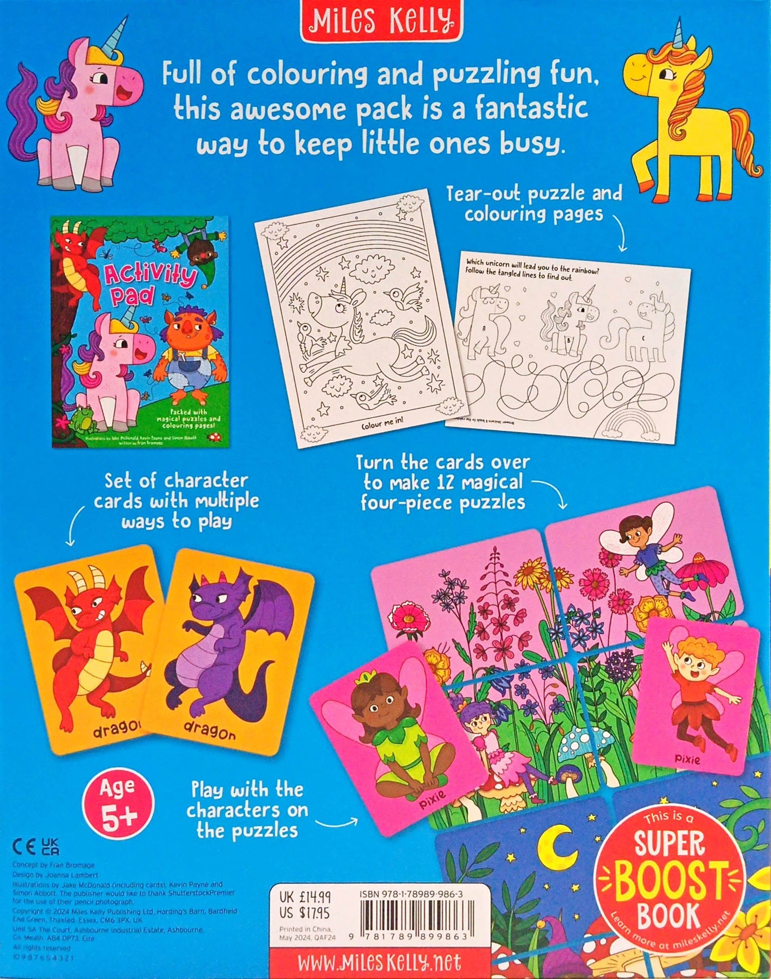 Sure to keep little ones entertained, this fun-filled activity pack is bursting with unicorns and other magical creatures. Within the folder is a write-in activity pad featuring colouring pages and puzzle pages, with engaging black and white illustrations. Also included are a set of colourful push-out pieces with charming characters to encourage imaginative play. • Black and white activity pad containing both colouring pages and puzzle pages, with mazes, dot-to-dots, wordsearches and more • Set of colourful push-out and play pieces featuring unicorns and other magical characters • Pack is contained within a sturdy folder