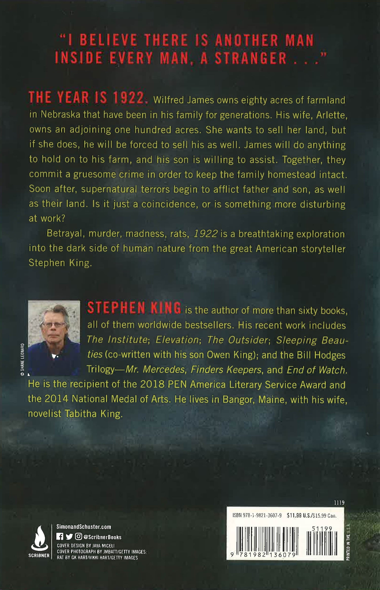 Betrayal, murder, madness, rats, 1922 is a breathtaking exploration into the dark side of human nature from the great American storyteller Stephen King.