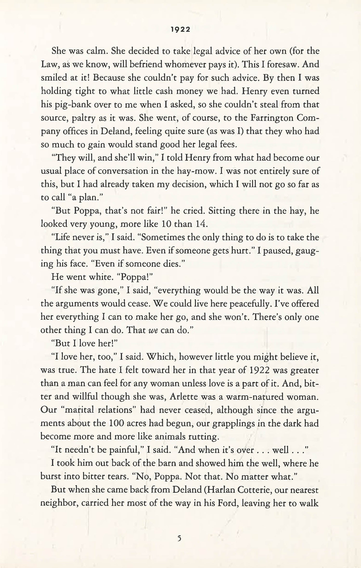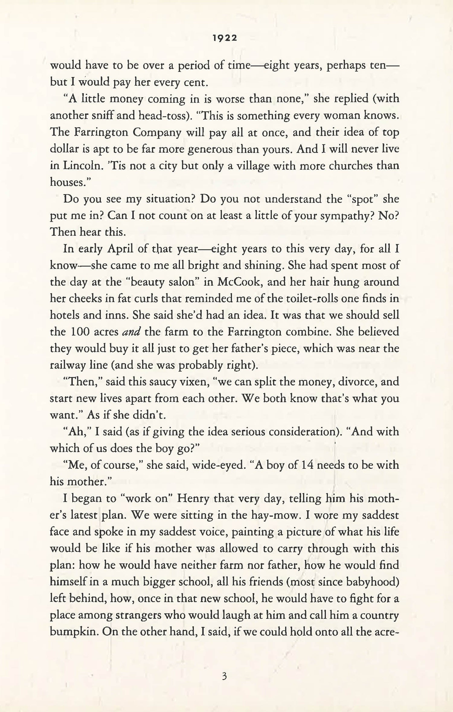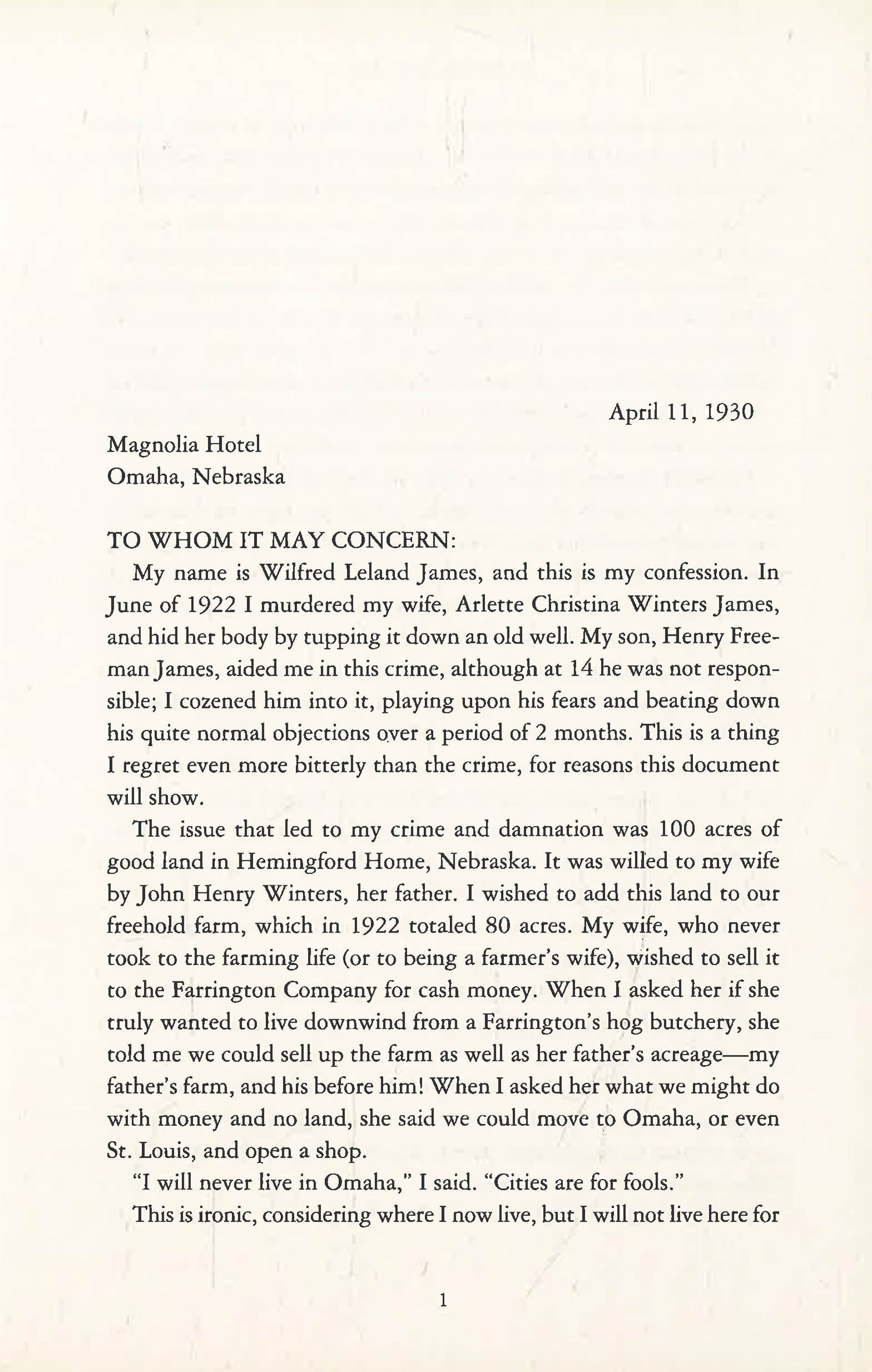 Wilfred James owns eighty acres of farmland in Nebraska that have been in his family for generations. His wife, Arlette, owns an adjoining one hundred acres. She wants to sell her land but if she does, Wilfred will be forced to sell as well. James will do anything to hold onto his farm, and he'll get his son to go along.