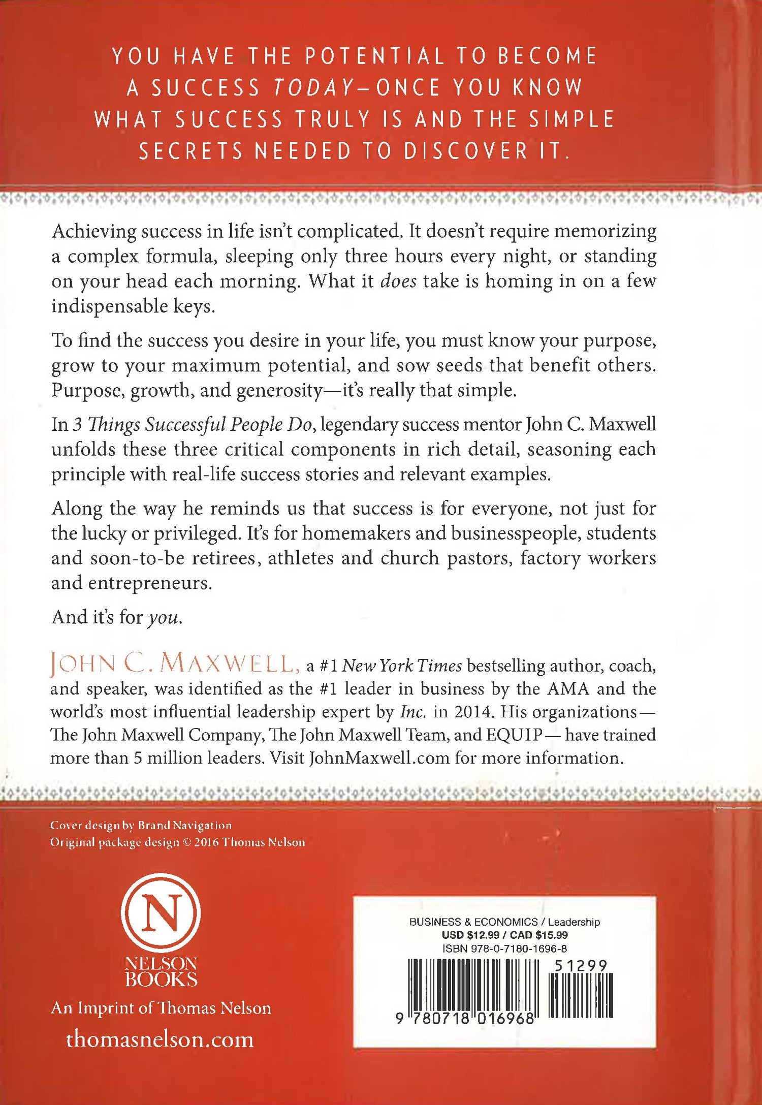 The single most fulfilling, game-changing state of mind a person can adopt is the notion that success is in the journey itself. Because the fact is, there are simply too many variables out of our control to define our success on outcomes only. Life is not a winner-take-all championship game but a an excruciatingly long season with multiple chances every day to learn from losses, grow from successes, and make the appropriate changes along the way.In 3 Things Successful People Do, New York Times bestselling author, coach, and speaker John C. Maxwell provides insight into what it means to truly be on the journey to success. No matter where you are on your journey, this invaluable resource will help you discover your personal road map and equip you with what you will need to change course, if necessary, and keep growing.When you surrender superficial notions of “arrival” and realize that the daily process is what makes your goals real, you haven’t just changed the game of success . . . you’ve become a success already.