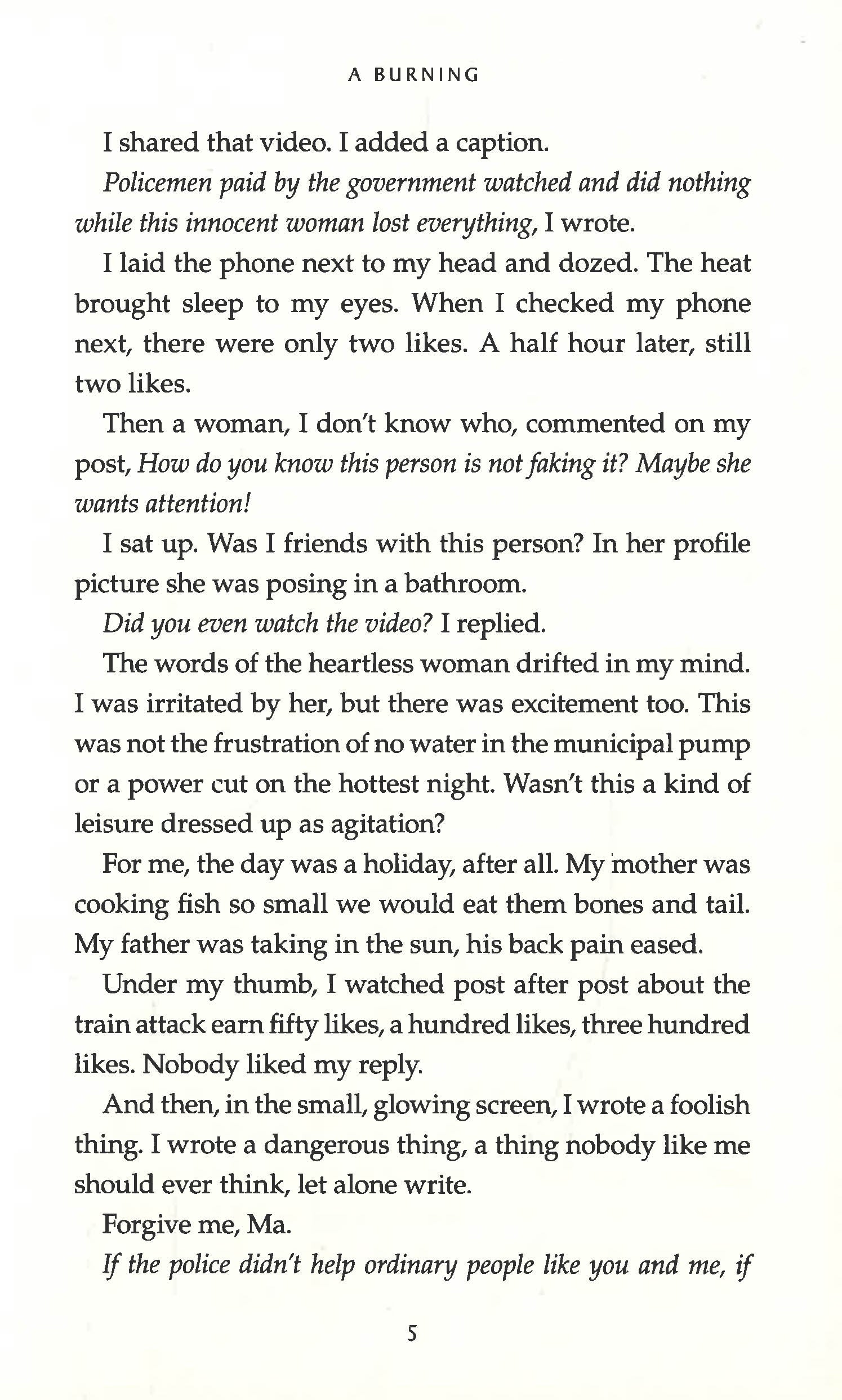 Taut, symphonic, propulsive, and riveting from its opening lines, A Burning has the force of an epic while being so masterfully compressed it can be read in a single sitting. Majumdar writes with dazzling assurance at a breakneck pace on complex themes that read here as the components of a thriller: class, fate, corruption, justice, and what it feels like to face profound obstacles and yet nurture big dreams in a country spinning toward extremism. An extraordinary debut.