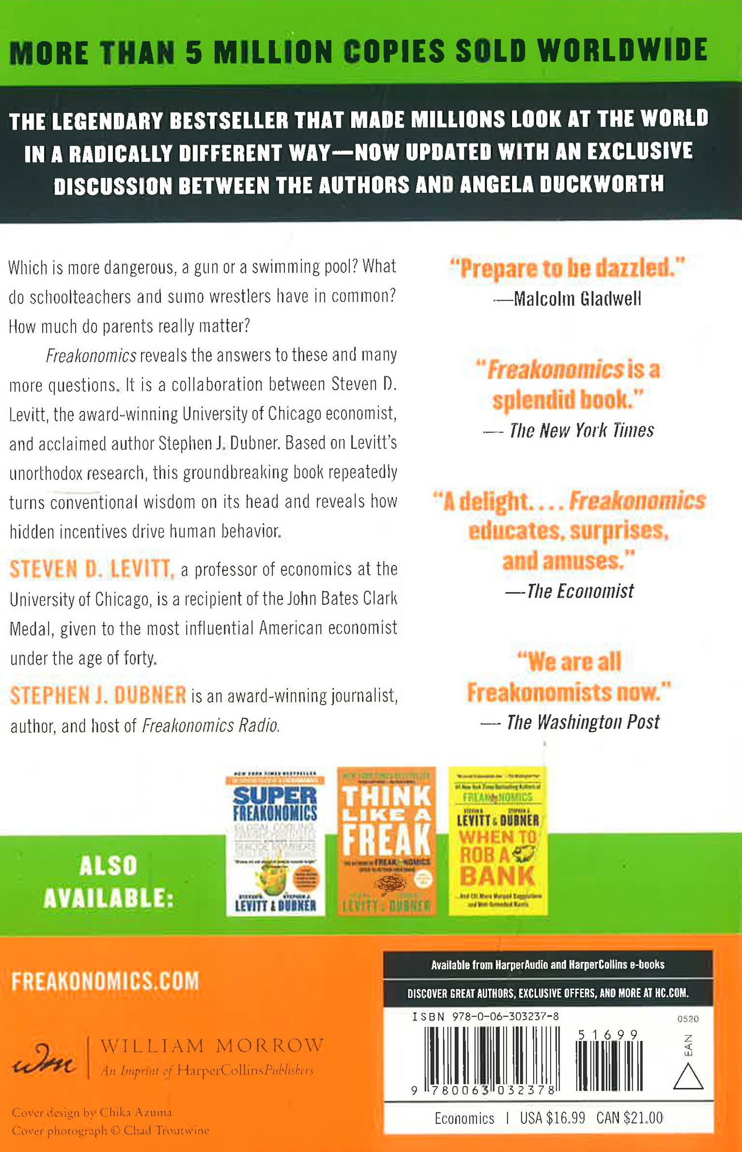 Which is more dangerous, a gun or a swimming pool? Which should be feared more: snakes or french fries? Why do sumo wrestlers cheat? In this groundbreaking book, leading economist Steven Levitt—Professor of Economics at the University of Chicago and winner of the American Economic Association’s John Bates Clark medal for the economist under 40 who has made the greatest contribution to the discipline—reveals that the answers. Joined by acclaimed author and podcast host Stephen J. Dubner, Levitt presents a brilliant—and brilliantly entertaining—account of how incentives of the most hidden sort drive behavior in ways that turn conventional wisdom on its head.