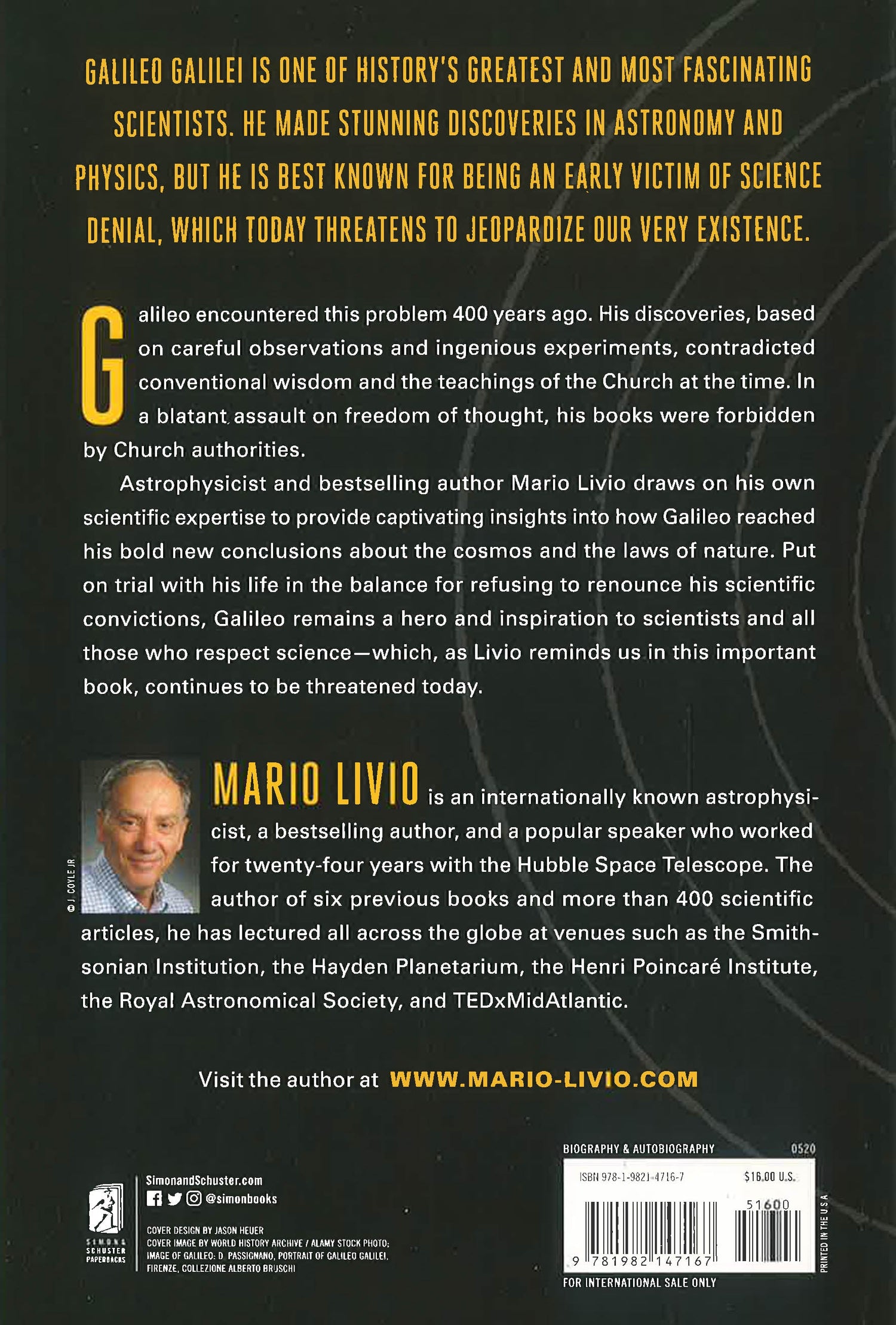 A fresh interpretation of the life of Galileo Galilei, one of history's greatest and most fascinating scientists, that sheds new light on his discoveries and how he was challenged by science deniers. "We really need this story now, because we're living through the next chapter of science denial" (Bill McKibben). Galileo's story may be more relevant today than ever before. At present, we face enormous crises-such as the minimization of the dangers of climate change-because the science behind these threats is erroneously questioned or ignored. Galileo encountered this problem 400 years ago. His discoveries, based on careful observations and ingenious experiments, contradicted conventional wisdom and the teachings of the church at the time. Consequently, in a blatant assault on freedom of thought, his books were forbidden by church authorities. Astrophysicist and bestselling author Mario Livio draws on his own scientific expertise to provide captivating insights into how Galileo reached his bold new conclusions about the cosmos and the laws of nature. A freethinker who followed the evidence wherever it led him, Galileo was one of the most significant figures behind the scientific revolution. He believed that every educated person should know science as well as literature, and insisted on reaching the widest audience possible, publishing his books in Italian rather than Latin. Galileo was put on trial with his life in the balance for refusing to renounce his scientific convictions. He remains a hero and inspiration to scientists and all of those who respect science-which, as Livio reminds us in this gripping book, remains threatened even today.