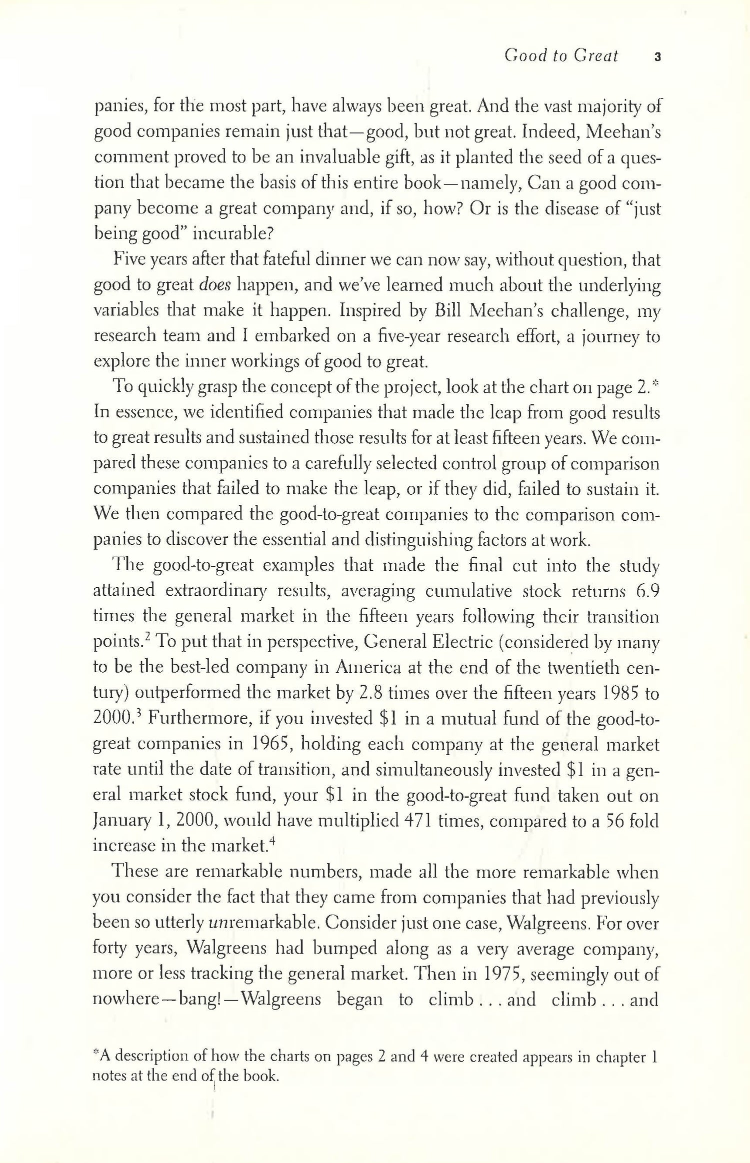 Using tough benchmarks, Collins and his research team identified a set of elite companies that made the leap to great results and sustained those results for at least fifteen years. How great? After the leap, the good-to-great companies generated cumulative stock returns that beat the general stock market by an average of seven times in fifteen years, better than twice the results delivered by a composite index of the world's greatest companies, including Coca-Cola, Intel, General Electric, and Merck.