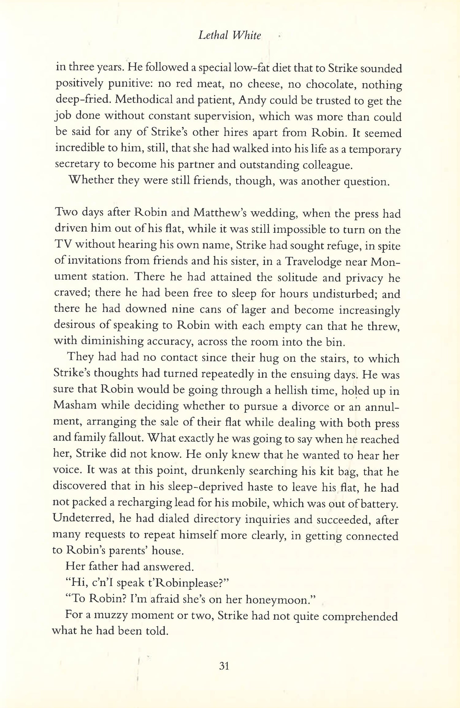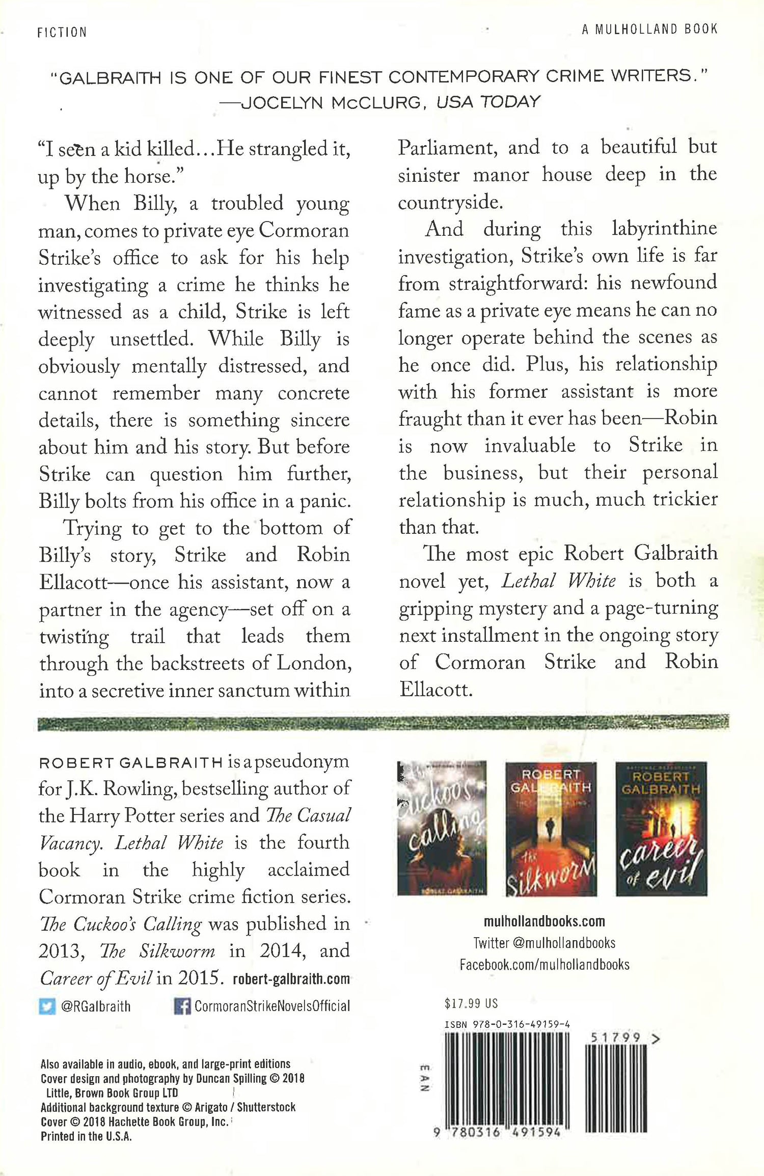 Epic and enthralling, Lethal White is the gripping fourth instalment in the ongoing story of Cormoran Strike and Robin Ellacott.