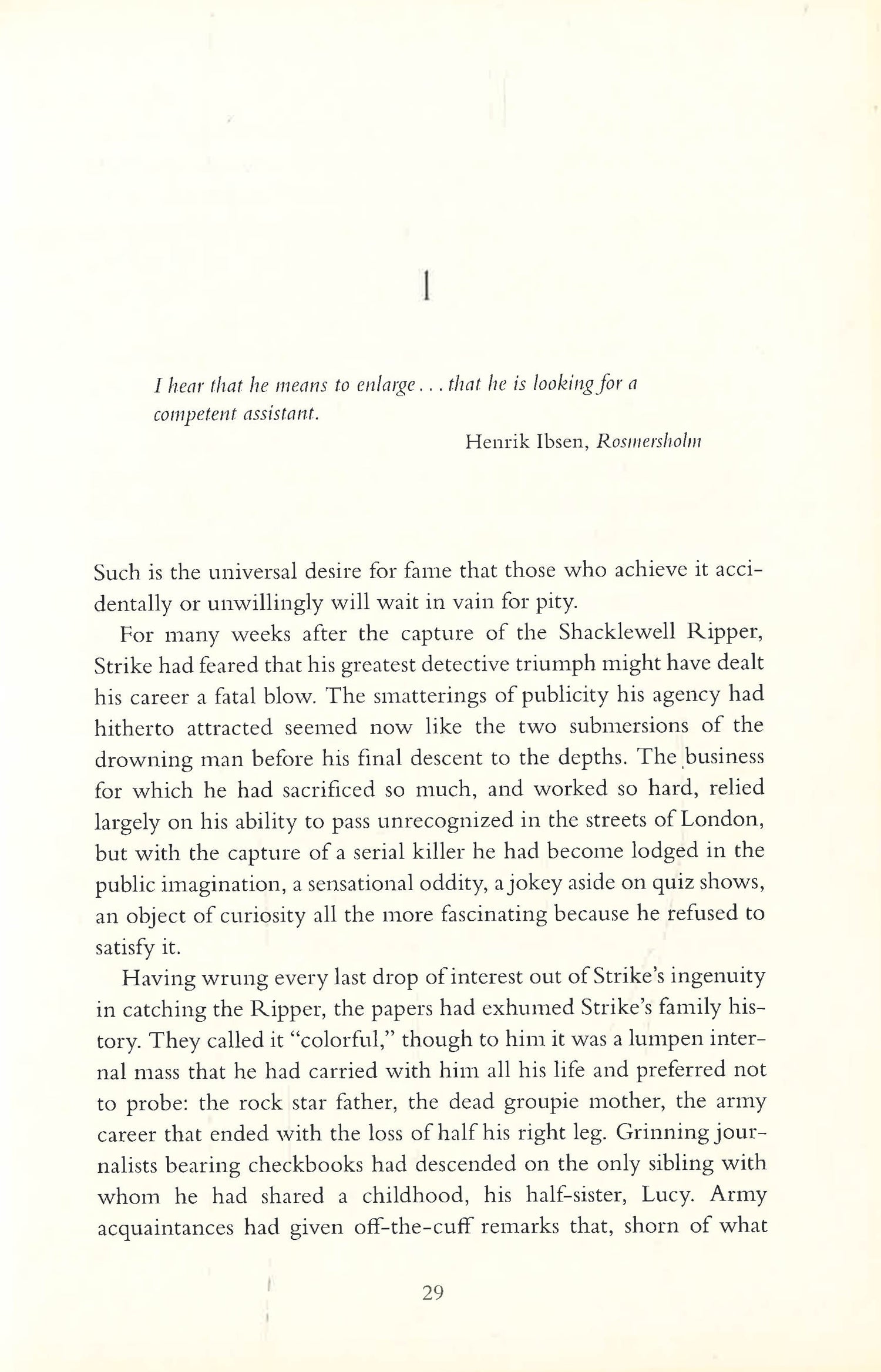 Trying to get to the bottom of Billy's story, Strike and Robin Ellacott - once his assistant, now a partner in the agency - set off on a twisting trail that leads them through the backstreets of London, into a secretive inner sanctum within Parliament, and to a beautiful but sinister manor house deep in the countryside.