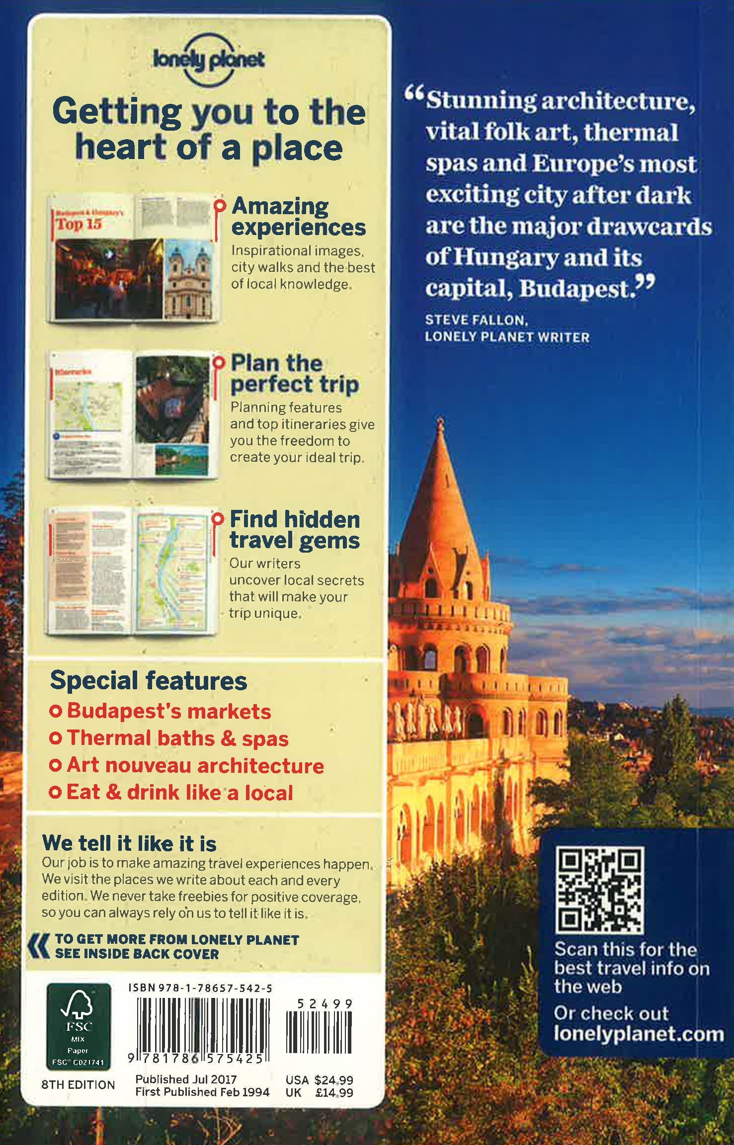Lonely Planet: The world's leading travel guide publisher Lonely Planet Budapest & Hungary is your passport to all the most relevant and up-to-date advice on what to see, what to skip, and what hidden discoveries await you. Ogle sinuous Art Nouveau architecture in Budapest, take a cruise along the blue Danube, or see the dust fly at a cowboy show -all with your trusted travel companion. Get to the heart of Hungary and begin your journey now! Inside Lonely Planet's Budapest & Hungary Travel Guide: Colour maps and images throughout Highlights and itineraries show you the simplest way to tailor your trip to your own personal needs and interests Insider tips save you time and money, and help you get around like a local, avoiding crowds and trouble spots Essential info at your fingertips - including hours of operation, phone numbers, websites, transit tips, and prices Honest reviews for all budgets - including eating, sleeping, sight-seeing, going out, shopping, and hidden gems that most guidebooks miss Cultural insights give you a richer and more rewarding travel experience - including history, architecture, painting, folk art, music, literature, etiquette, religion, landscapes, wildlife, wine, cuisine, and more. Free, convenient pull-out Budapest map (included in print version), plus over 40 maps Useful features - including First Time Hungary, Eat & Drink Like a Local and Month by Month (annual festival calendar) Coverage of Budapest, the Danube Bend, Lake Balaton, Szeged, Pecs, Sopron, Southern Transdanubia, the Great Plain, Western Transdanubia, Eger, Northern Uplands, Szentendre, Visegrad, Villany, and more. The Perfect Choice: Lonely Planet Budapest & Hungary, our most comprehensive guide to Hungary, is perfect for those planning to both explore the top sights and take the road less travelled. About Lonely Planet: Since 1973, Lonely Planet has become the world's leading travel media company with guidebooks to every destination, an award-winning website, mobile and digital travel products, and a dedicated traveller community. Lonely Planet covers must-see spots but also enables curious travellers to get off beaten paths to understand more of the culture of the places in which they find themselves. The world awaits! Lonely Planet guides have won the TripAdvisor Traveler's Choice Award in 2012, 2013, 2014, 2015, and 2016. 'Lonely Planet. It's on everyone's bookshelves, it's in every traveller's hands. It's on mobile phones. It's on the Internet. It's everywhere, and it's telling entire generations of people how to travel the world.' - Fairfax Media 'Lonely Planet guides are, quite simply, like no other.' - New York Times