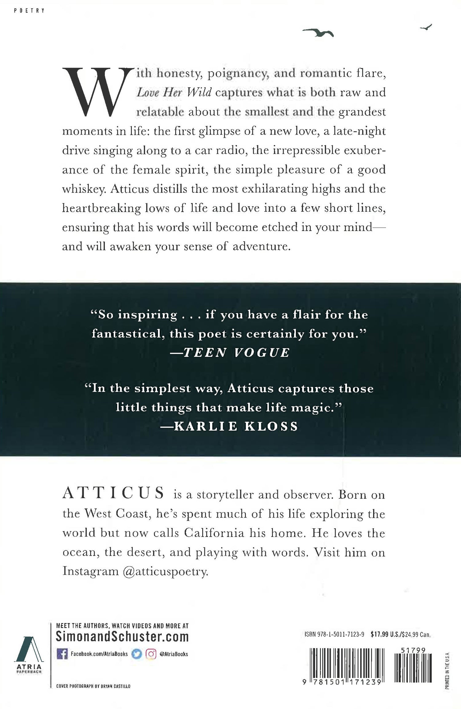 Love Her Wild is a collection of new and beloved poems from Atticus, the young writer who has captured the hearts and minds of hundreds of thousands of avid followers on his Instagram account @atticuspoetry, including superstars like Karlie Kloss and Shay Mitchell. He was dubbed the “#1 poet to follow” by Teen Vogue and “the world’s most tattoo-able” poet by Galore magazine, in Love Her Wild, Atticus captures what is both raw and relatable about the smallest and the grandest moments in life: the first glimpse of a new love in Paris; skinny dipping on a summer’s night; the irrepressible exuberance of the female spirit; or drinking whiskey in the desert watching the rising sun. With honesty, poignancy, and romantic flair, Atticus distills the most exhilarating highs and the heartbreaking lows of life and love into a few perfectly evocative lines, ensuring that his words will become etched in your mind—and will awaken your sense of adventure.