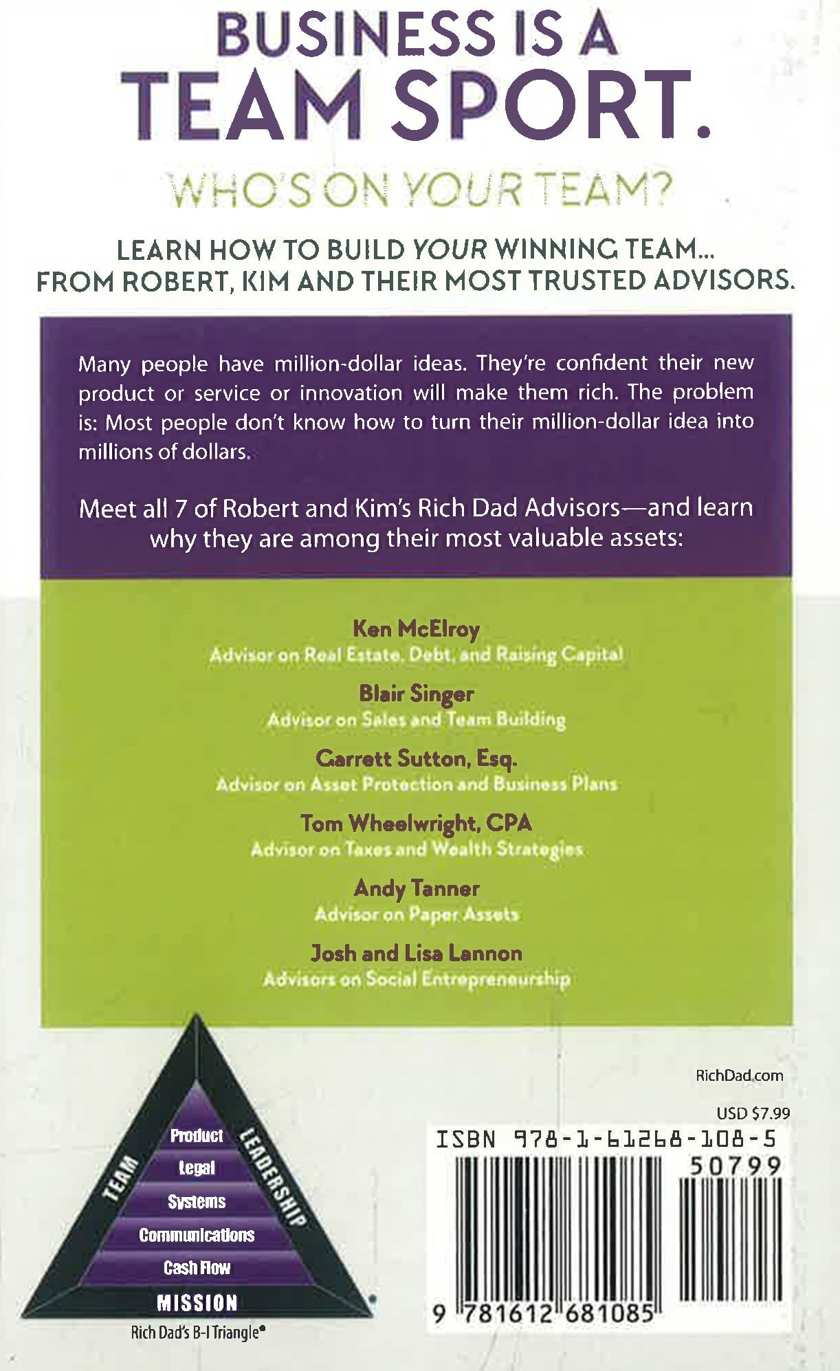 Many people have million-dollar ideas. They're confident that their new product or service or innovation will make them rich and that all their dreams will come true. The problem is: Most people don't know how to turn their million-dollar idea into millions of dollars. According to many social scientists, the most important thing in life is a person's social and professional network. In other words, the people around us - our associates, our team, our friends. The people we surround ourselves with - and the people we go to for advice and guidance-can mean the difference between success and failure. And as he taught in Rich Dad Poor Dad, if the people around you have a poor person's mindset, it's likely that you'll be, or stay, poor. Your team, in life and in business, will determine if your million-dollar idea will give you a million-dollar payday.