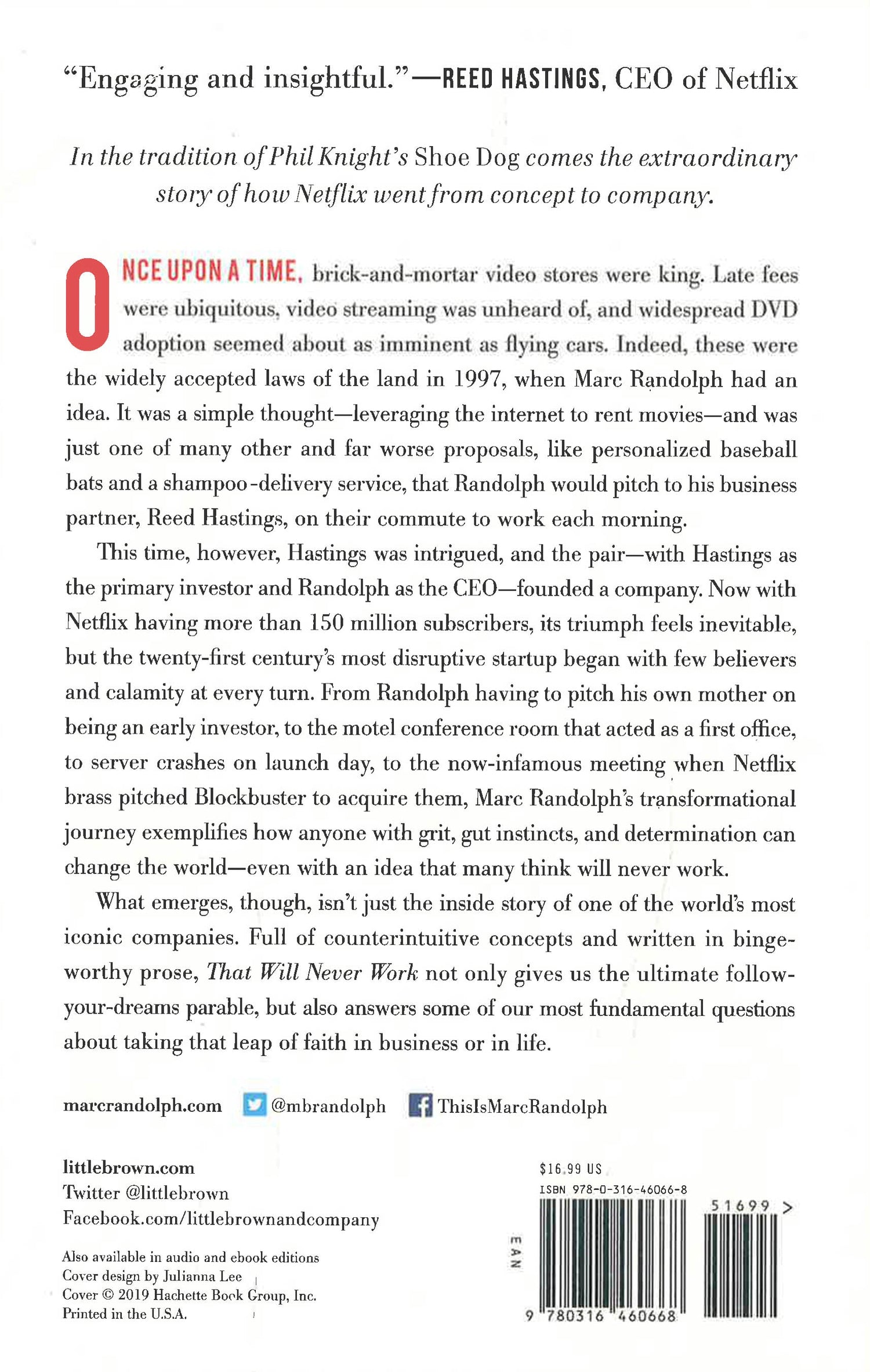 But Hastings was intrigued, and the pair--with Hastings as the primary investor and Randolph as the CEO--founded a company. Now with over 150 million subscribers, Netflix's triumph feels inevitable, but the twenty first century's most disruptive start up began with few believers and calamity at every turn. From having to pitch his own mother on being an early investor, to the motel conference room that served as a first office, to server crashes on launch day, to the now-infamous meeting when Netflix brass pitched Blockbuster to acquire them, Marc Randolph's transformational journey exemplifies how anyone with grit, gut instincts, and determination can change the world--even with an idea that many think will never work.