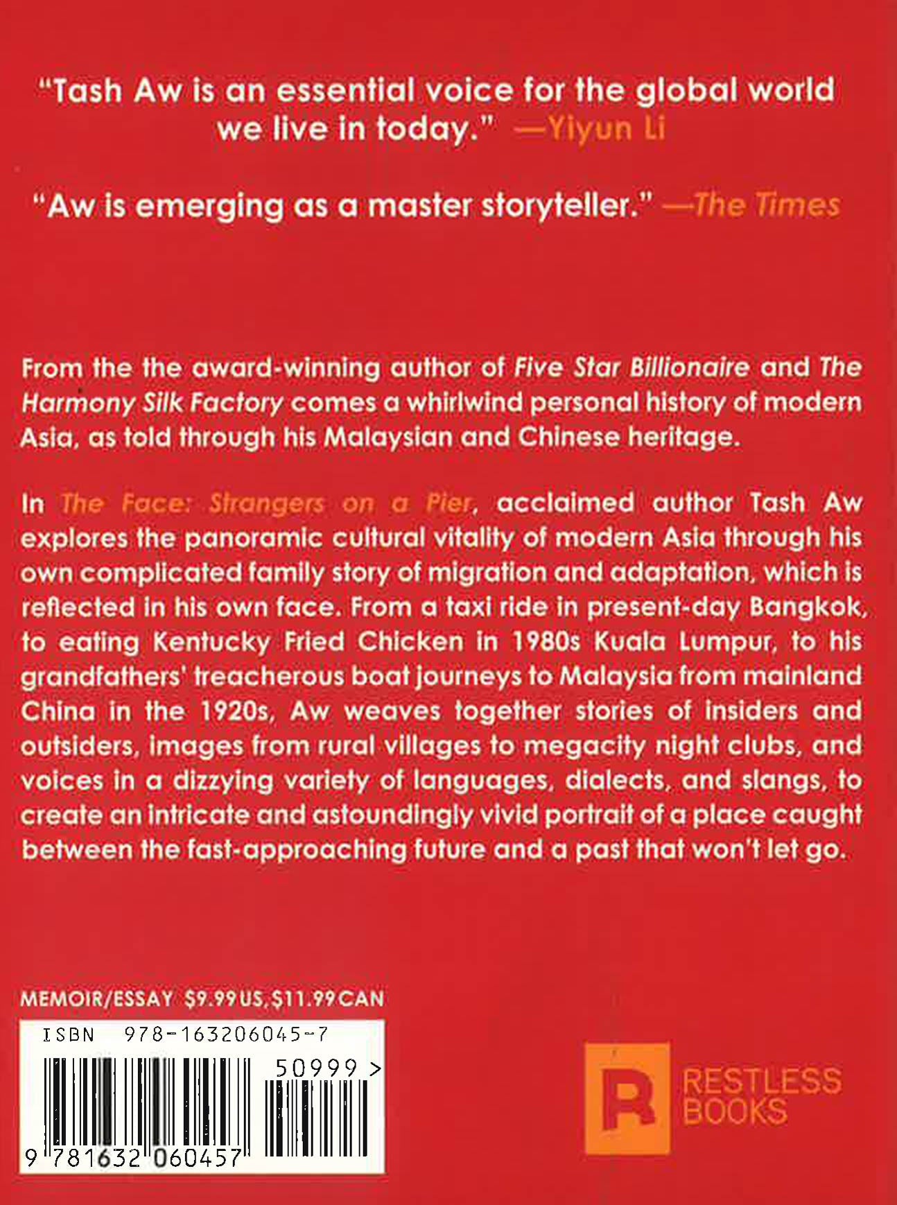 With his entry into Restless Book's The Face series, award-winning novelist Tash Aw explores the panoramic cultural vitality of modern Asia through his own complicated family story of migration and adaptation. From a taxi ride in present-day Bangkok, to eating Kentucky Fried Chicken in 1980s Kuala Lumpur, to his grandfathers' treacherous boat journeys to mainland China in the 1920s, Aw weaves together stories of insiders and outsiders, images from rural villages to megacity nightclubs and voices in a dizzying variety of dialects and slangs.
