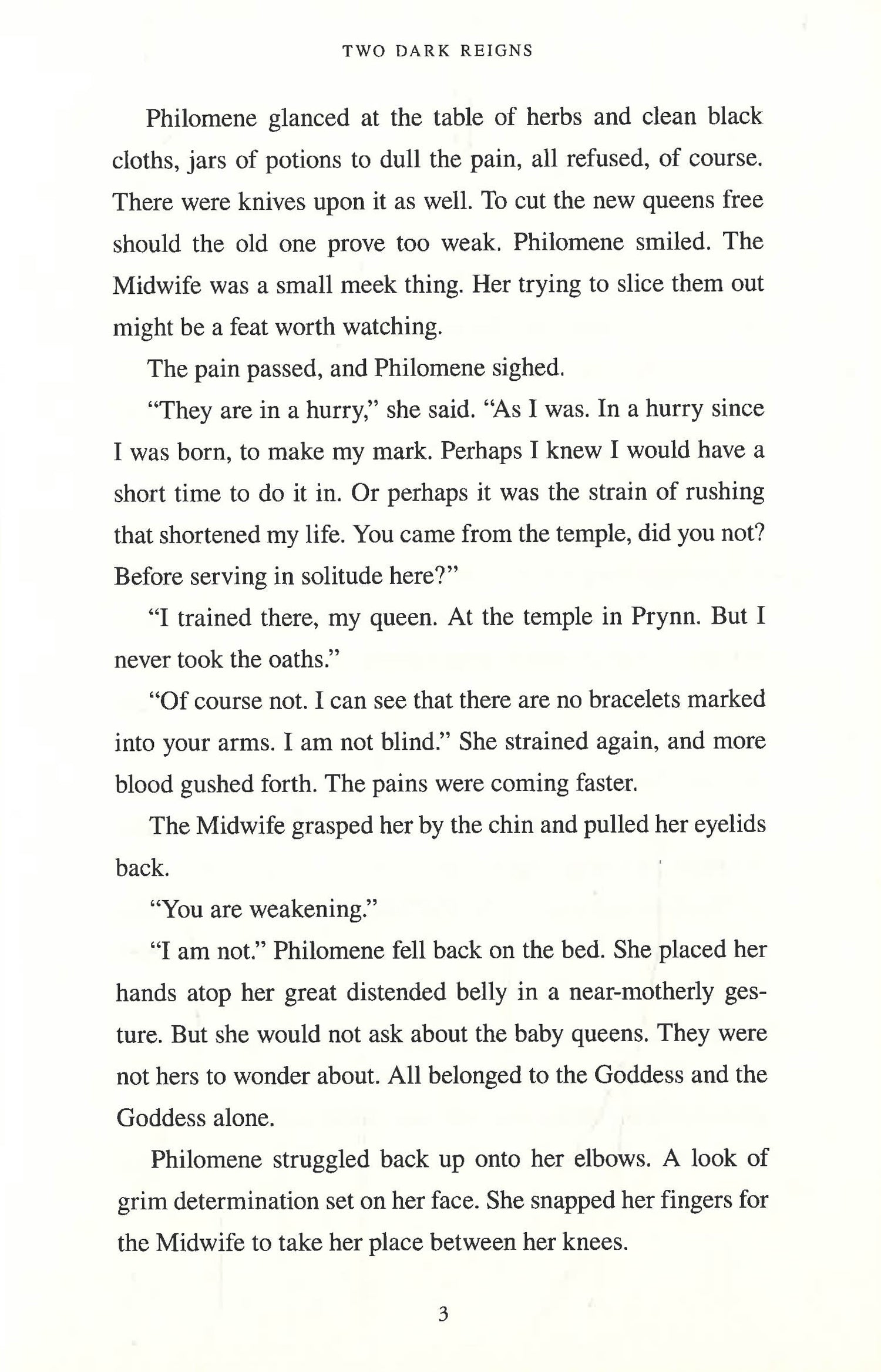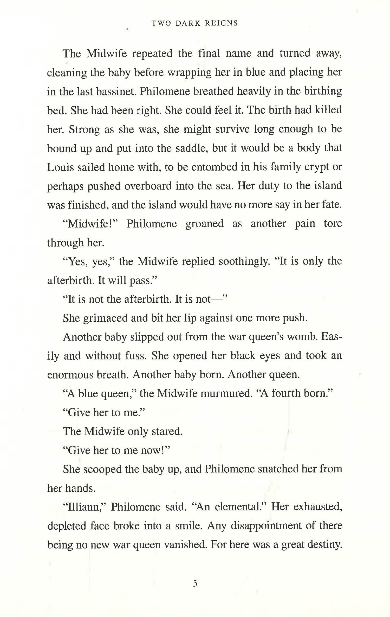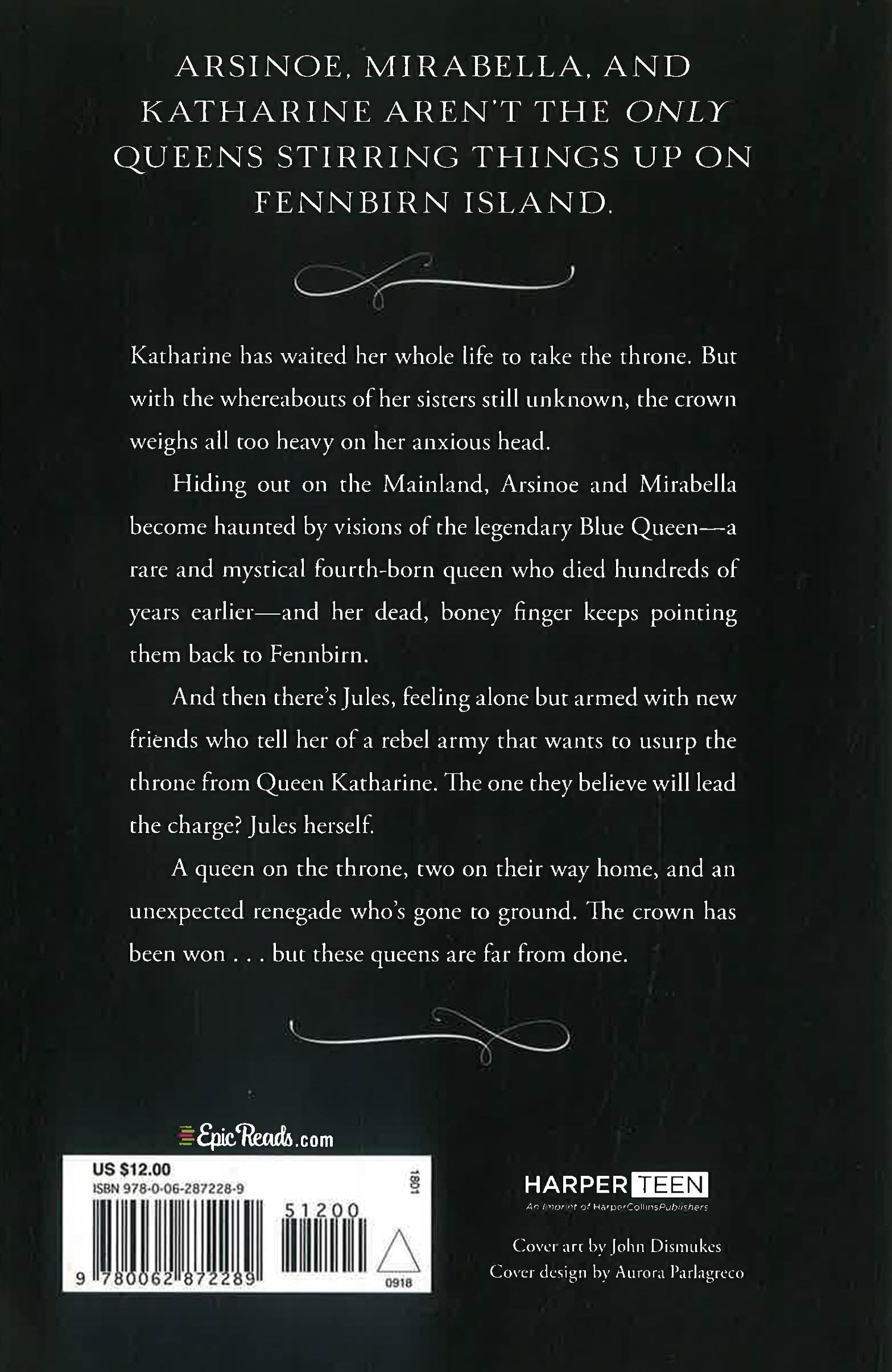 Mirabella and Arsinoe are alive, but in hiding on the mainland and dealing with a nightmare of their own: being visited repeatedly by a specter they think might be the fabled Blue Queen. Though she says nothing, her rotting, bony finger pointing out to sea is clear enough: return to Fennbirn.