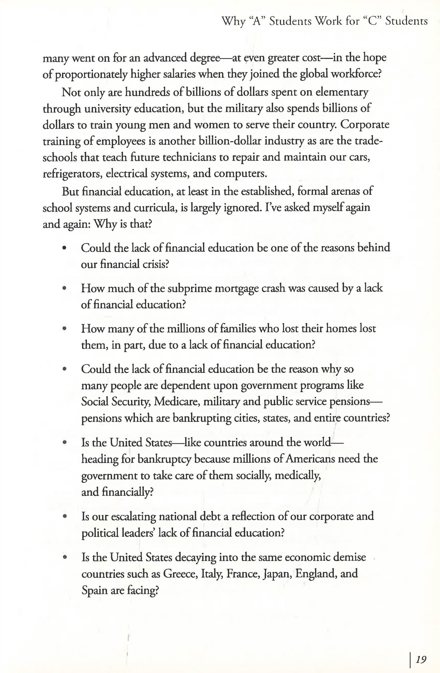 Kiyosaki expands on his belief that the school system was created to churn out 'Es' / Employees... those "A Students" who read well, memorize well and test well... and not the creative thinkers, visionaries and dreamers –entrepreneurs-in-the-making... those "C Students who grow up to be the innovators and creators of new ideas, businesses, applications and products.
