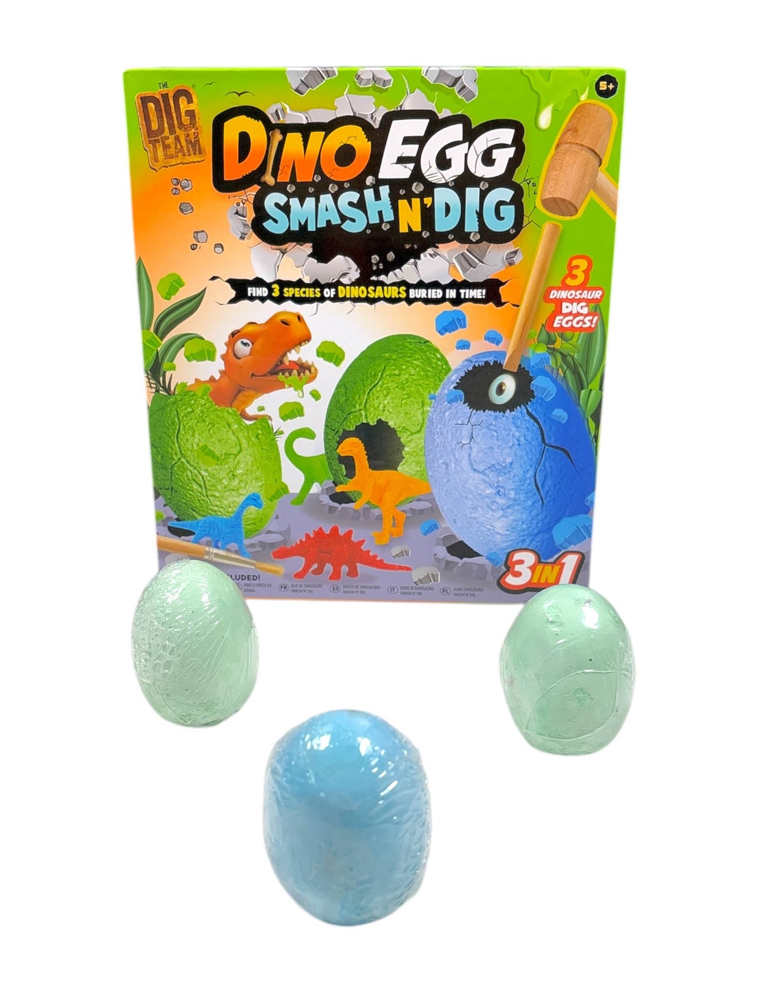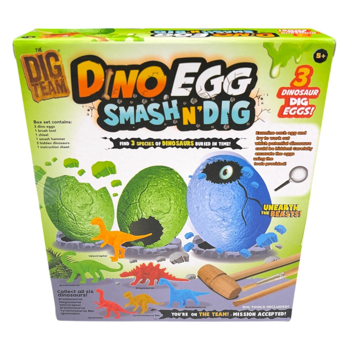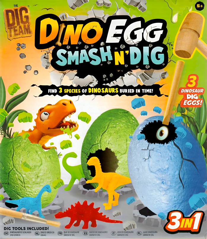 Age 5+ Box Set Contains - 3 Dino Eggs 1 Brush Tool 1 Chisel 1 Smash Hammer 3 Hidden Dinosaurs 1 Instruction Sheet.