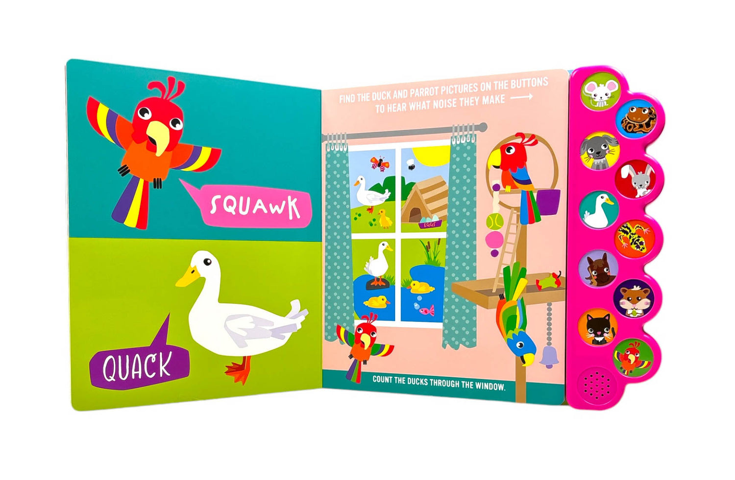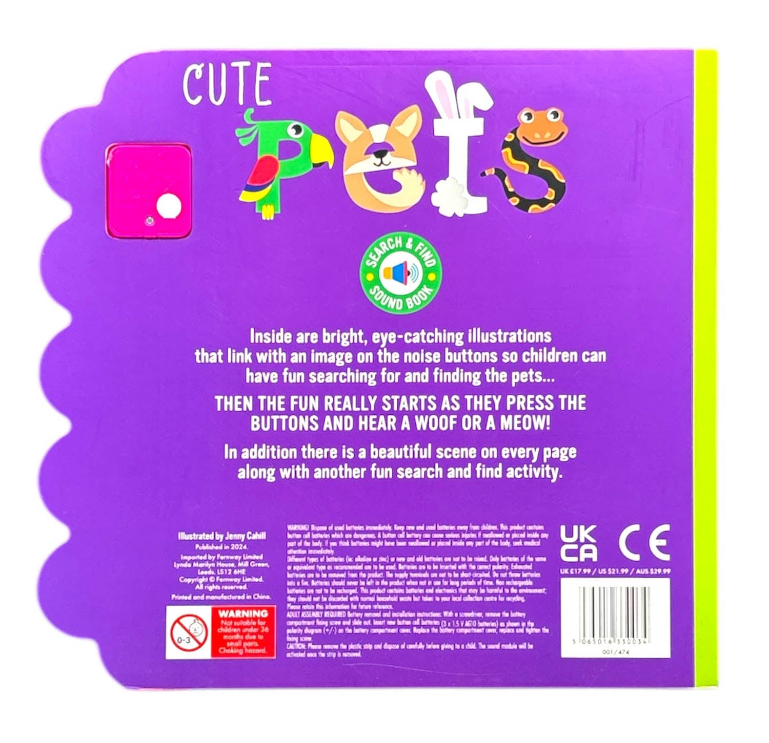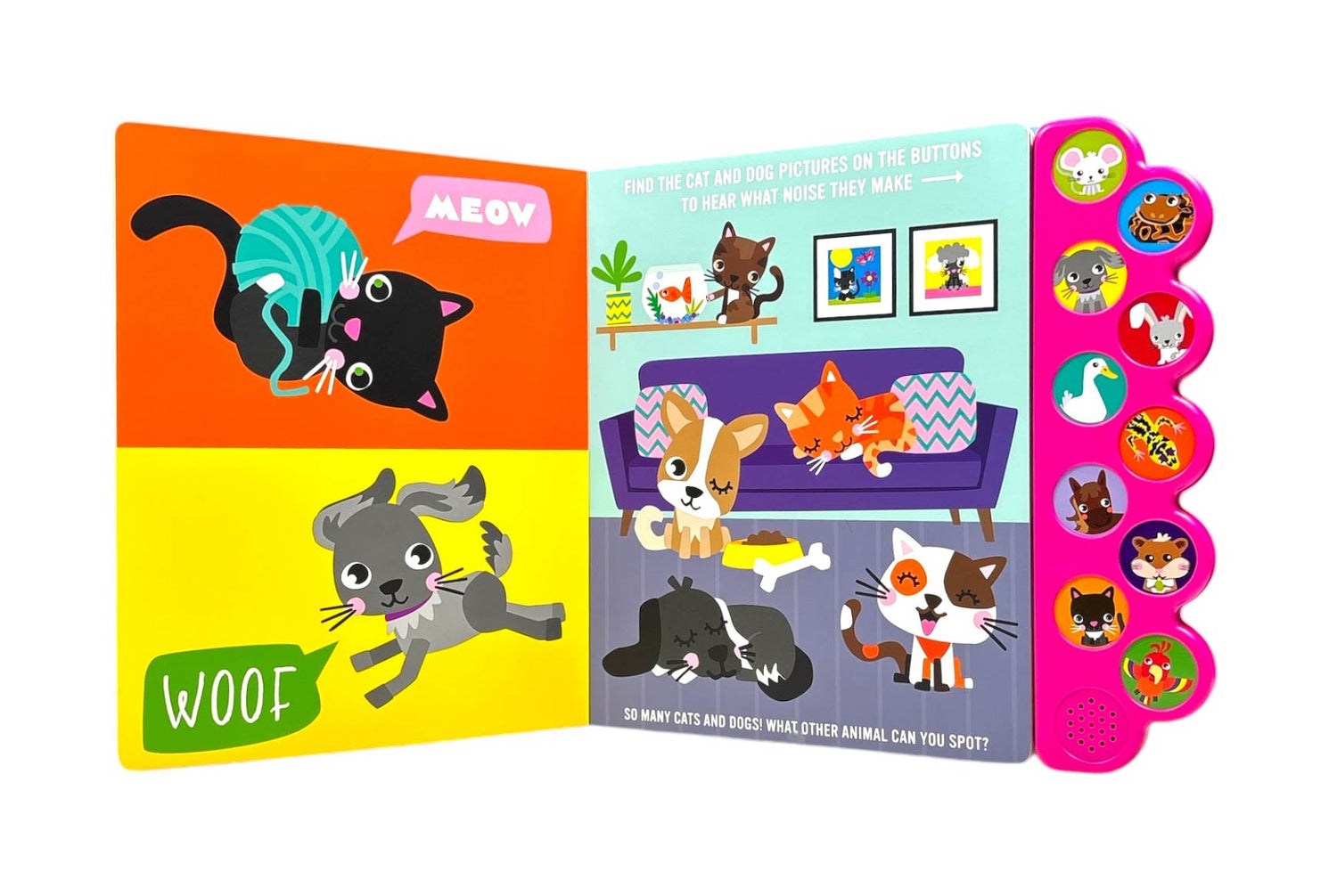 Inside are bright, eye-catching illustrations that link with an image on the noise buttons so children can have fun searching for and finding the pets..