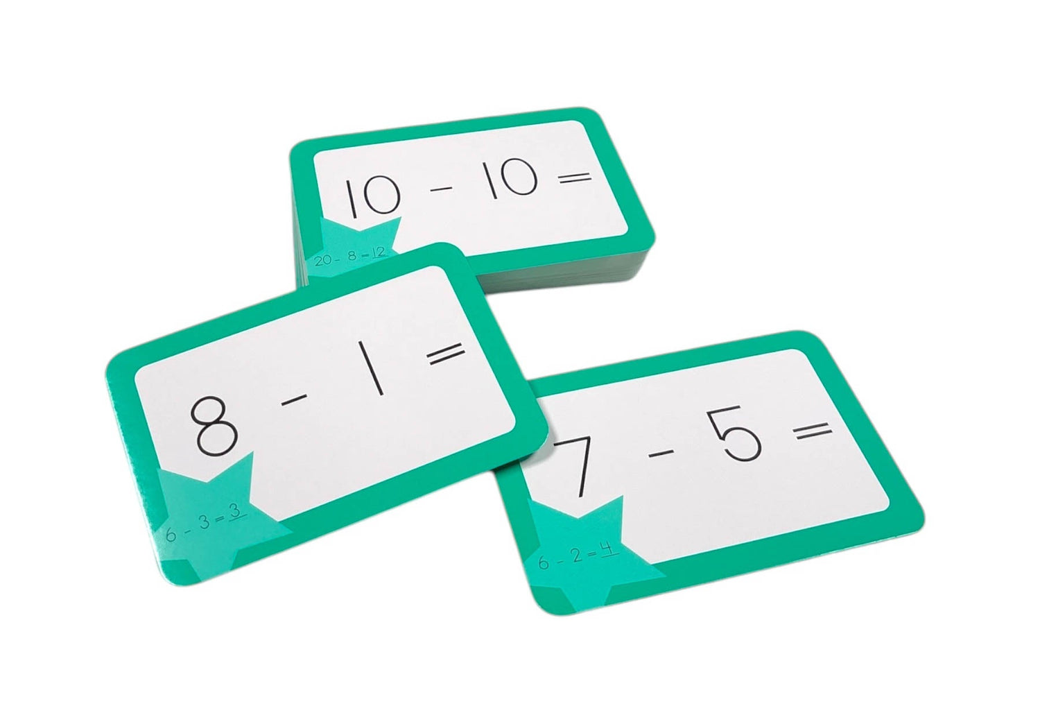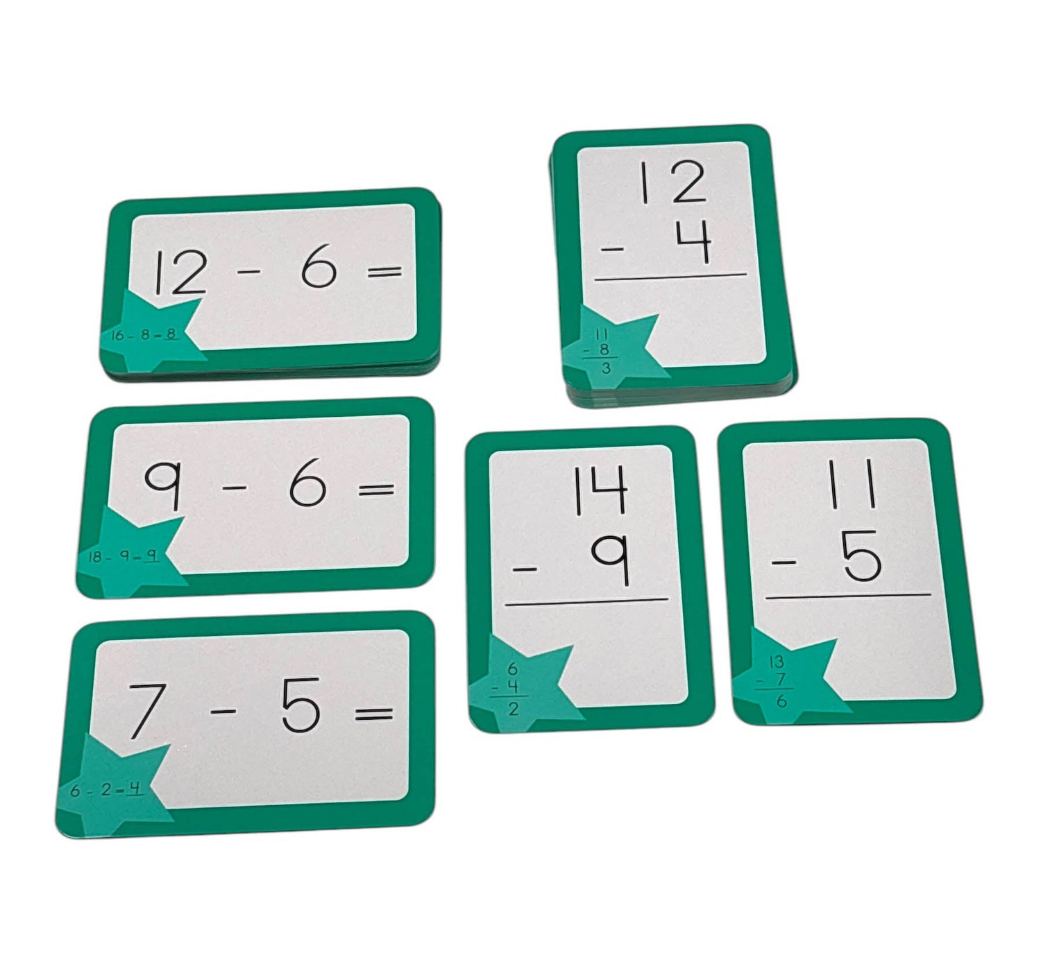 - Each card features a subtraction problem with its solution on the other side.