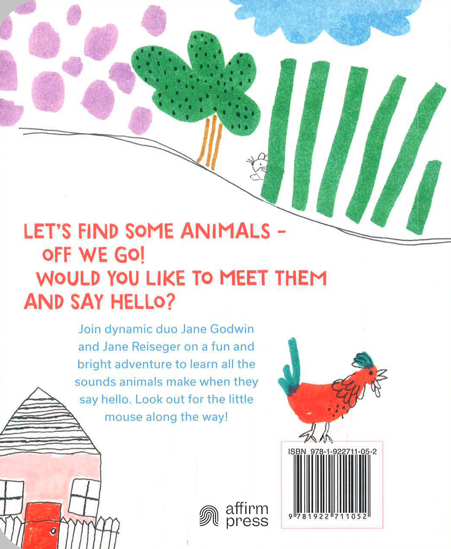 Join dynamic duo Jane Godwin and Jane Reiseger on a fun and bright adventure to learn all the sounds animals make when they say hello. Look out for the little mouse along the way!