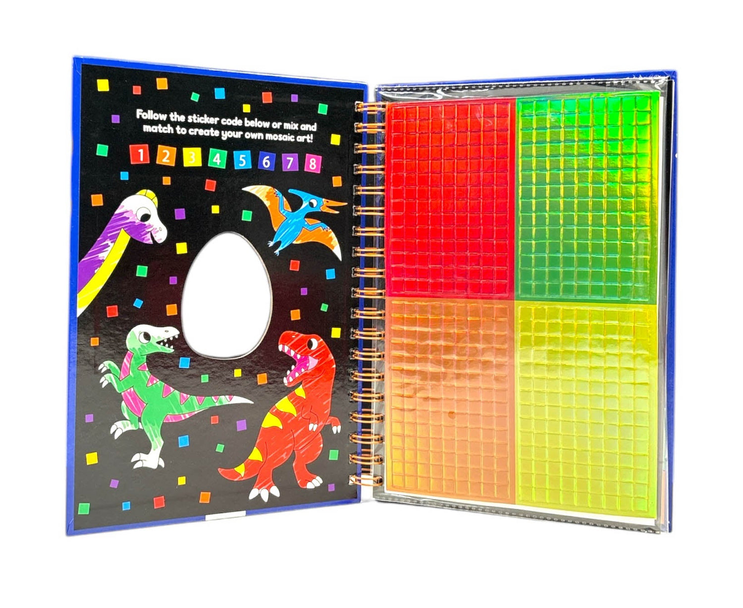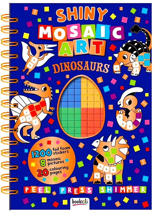 This interactive book contains 8 dino-themed mosaic pictures to complete using the 1000 shiny foil foam stickers, simply peel and press the shiny stickers onto the pictures to create your own dinosaur mosaics!