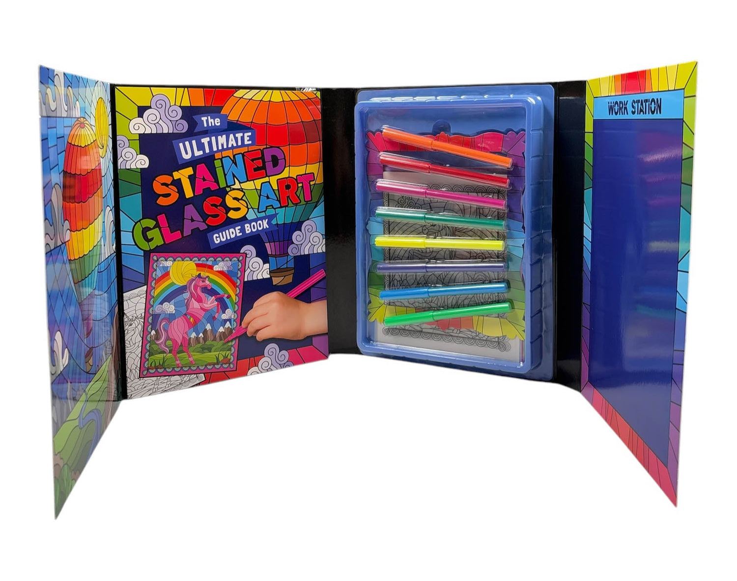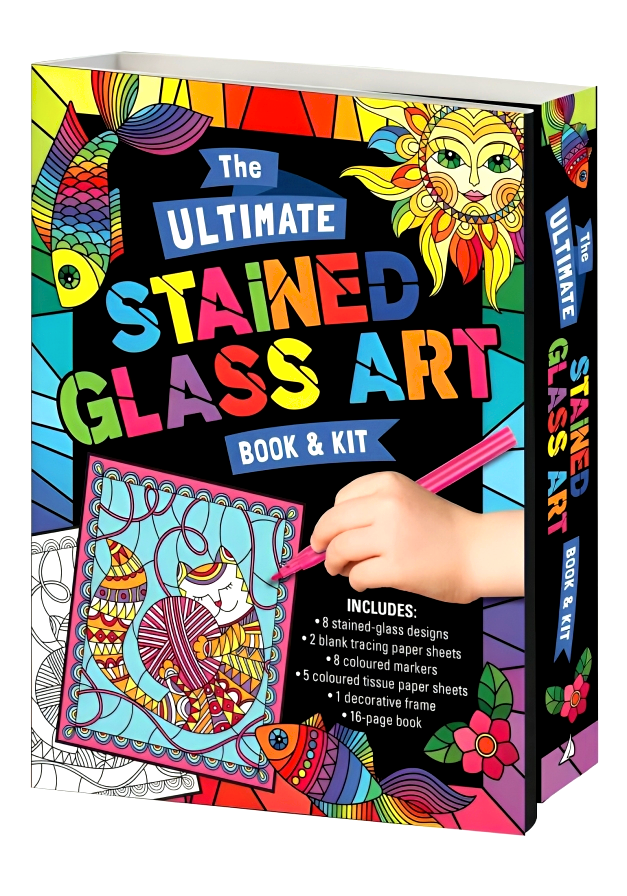 Packaged in a fold-out pack, this kit comes complete with 10 stained glass designs, 8 coloured markers, 5 coloured tissue paper sheets and 1 decorative frame. Also included is a 16-page book with instructions on how to make your very own stained glass window art.