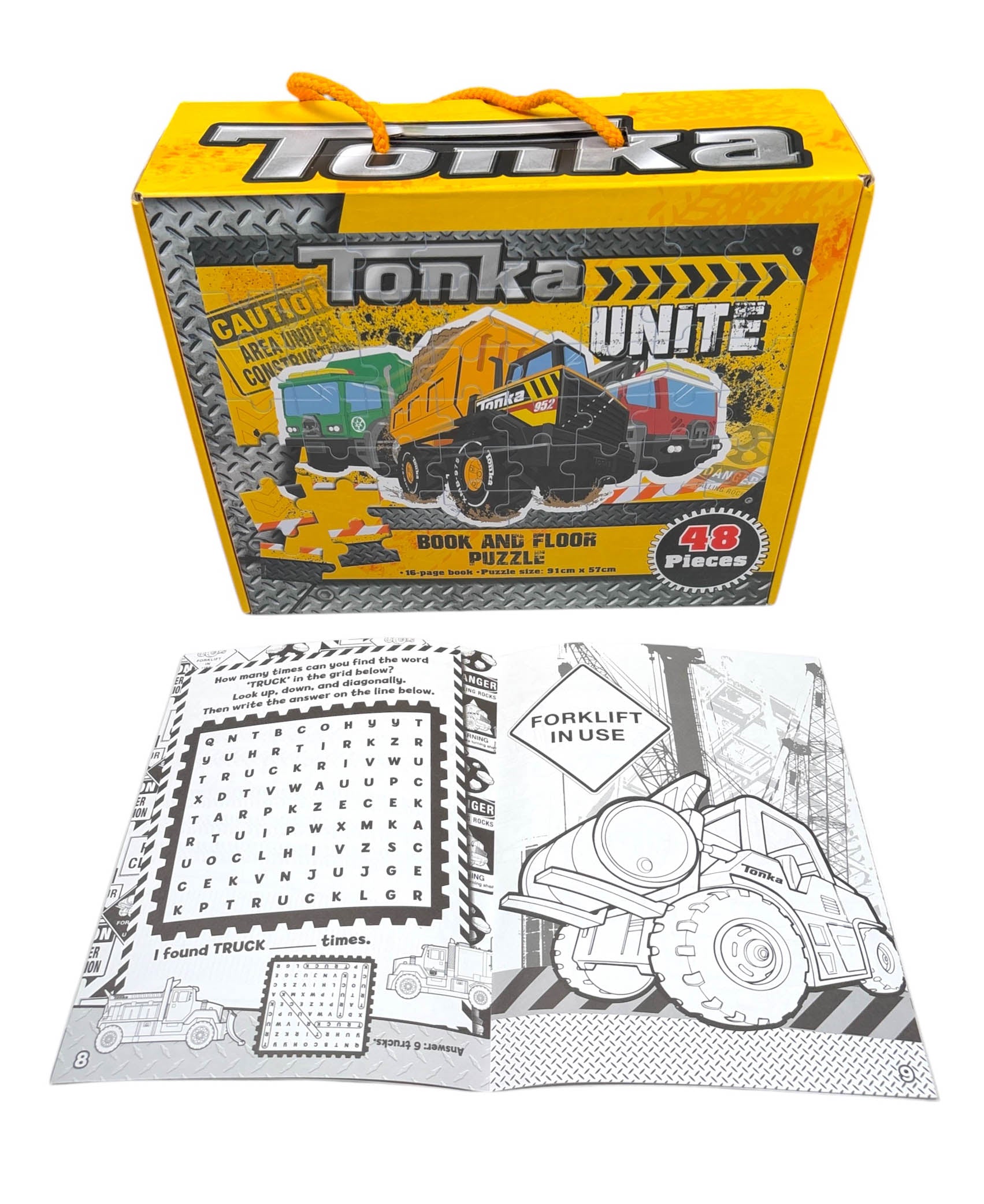This appealing carry-along format contains a large floor puzzle, suitable for ages 3+ with an accompanying activity book. Tonka trucks unite in a giant floor puzzle that little boys will love to piece together. All their favourite trucks come together in one truck-tastic scene!