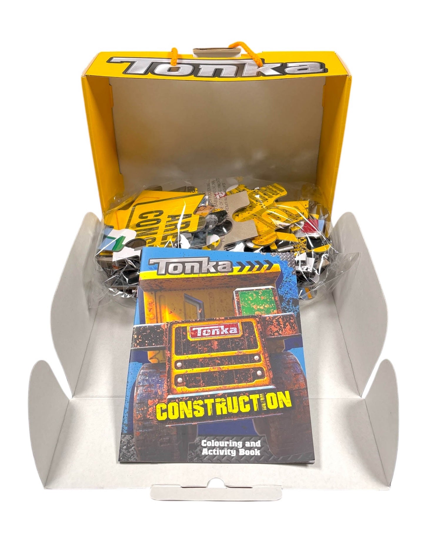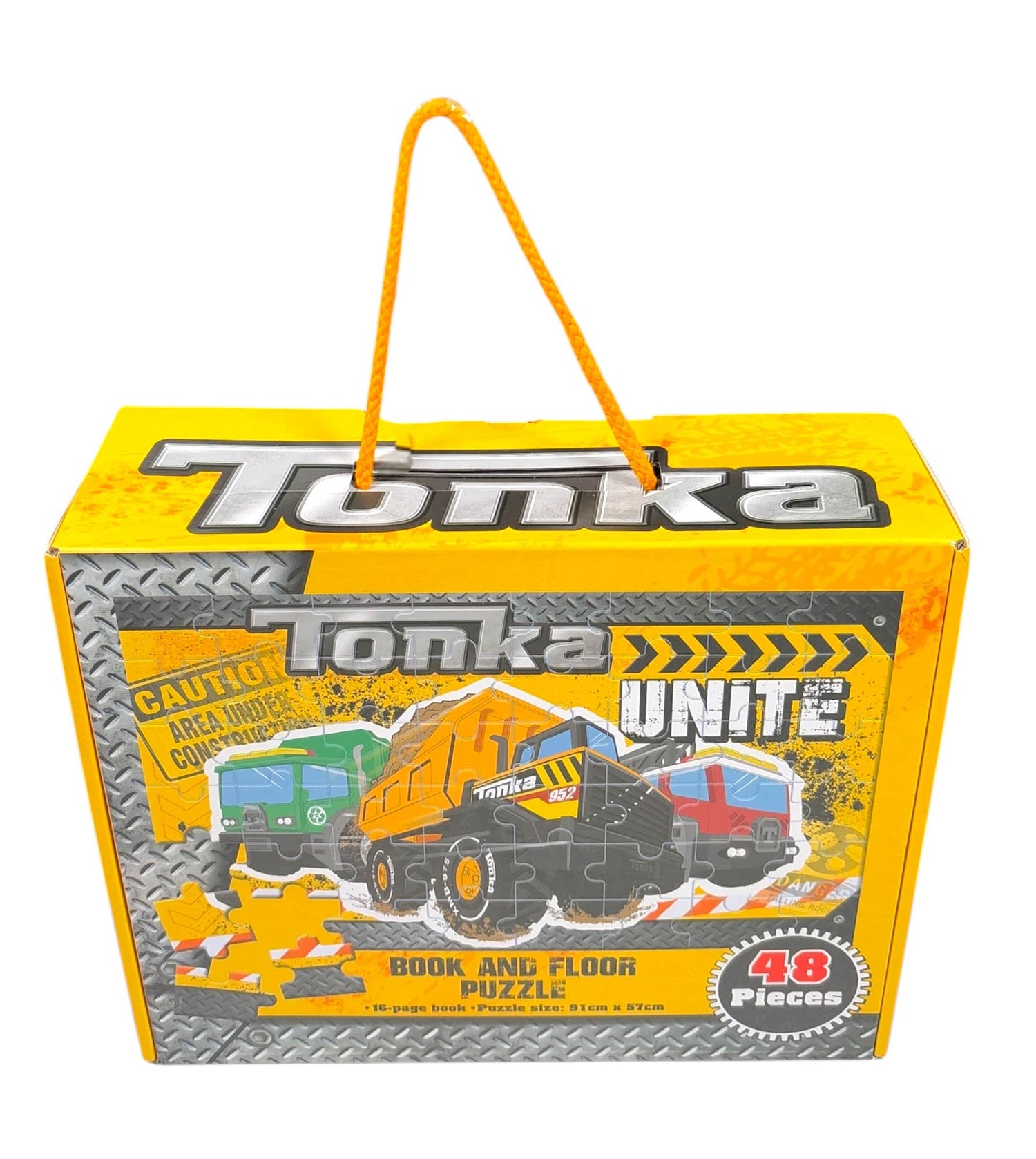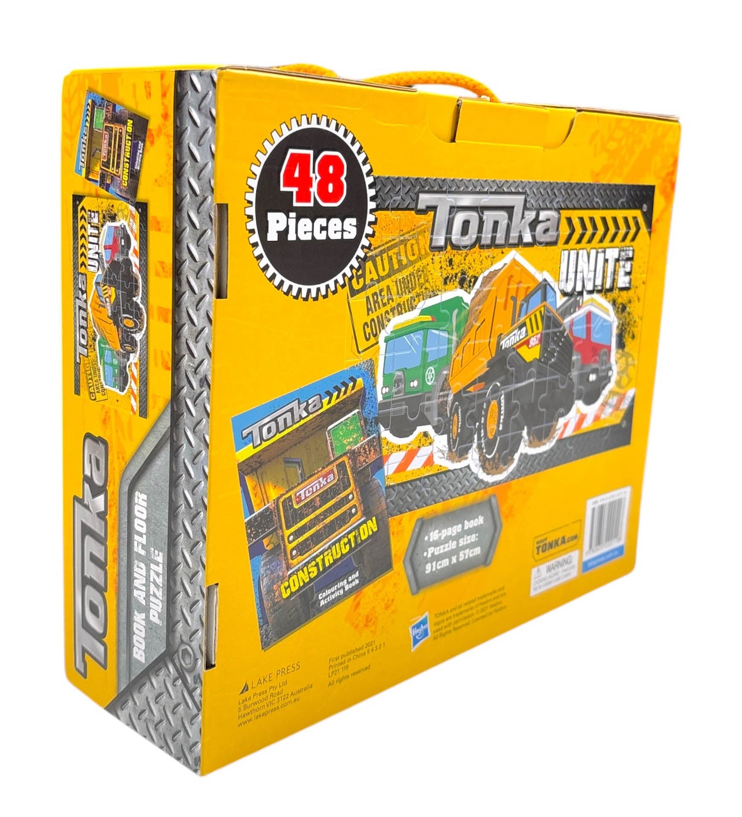 This appealing carry-along format contains a large floor puzzle, suitable for ages 3+ with an accompanying activity book. Tonka trucks unite in a giant floor puzzle that little boys will love to piece together. All their favourite trucks come together in one truck-tastic scene!