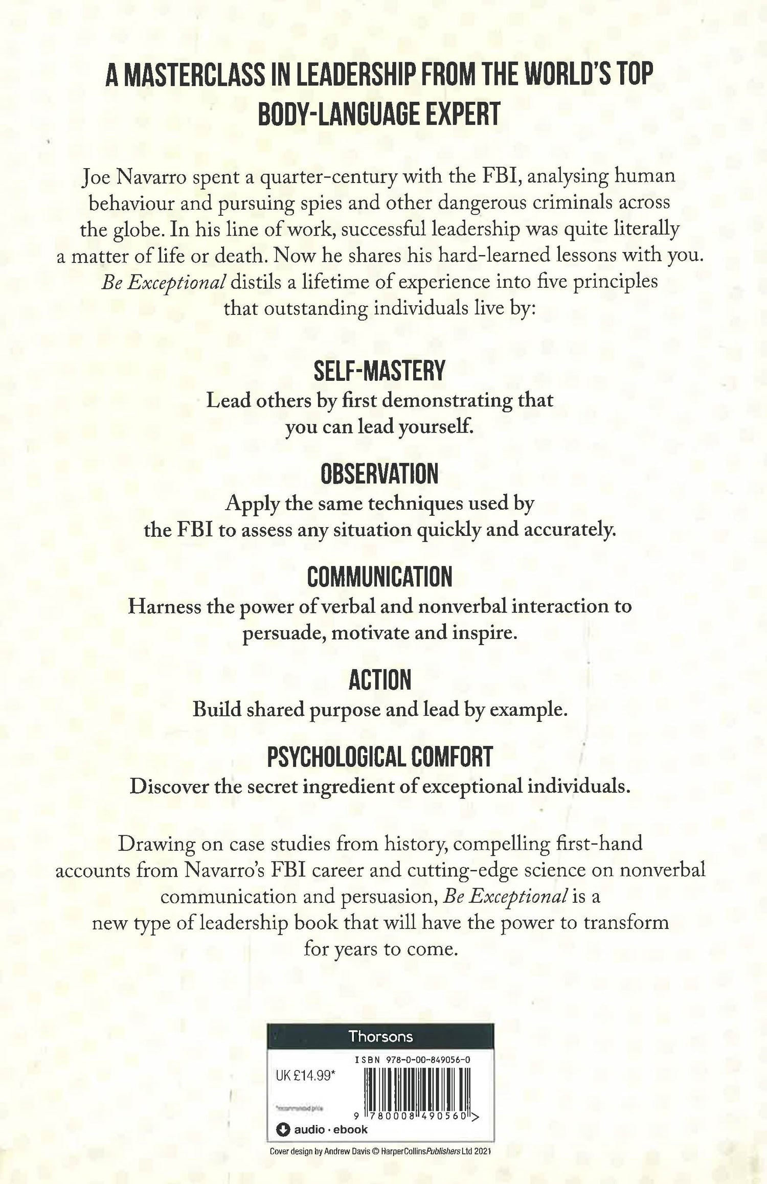 From internationally bestselling author and retired FBI agent Joe Navarro, a ground-breaking look at the five powerful principles that set exceptional individuals apart Joe Navarro spent a quarter century with the FBI, pursuing spies and other dangerous criminals across the globe. In his line of work, successful leadership was quite literally a matter of life or death. Now he brings his hard-earned lessons to you. Be Exceptional distils a lifetime of experience into five principles that outstanding individuals live by: Self-Mastery: To lead others, you must first demonstrate that you can lead yourself.Observation: Apply the same techniques used by the FBI to quickly and accurately assess any situation.Communication: Harness the power of verbal and nonverbal interaction to persuade, motivate, and inspire.Action: Build shared purpose and lead by example.Psychological Comfort: Discover the secret ingredient of exceptional individuals. Be Exceptional is the culmination of Joe Navarro's decades spent analysing human behaviour, conducting more than 10,000 interviews in the field, and making high-stakes behavioural assessments. Drawing upon case studies from history, compelling first-hand accounts from Navarro's FBI career, and cutting-edge science on nonverbal communication and persuasion, this is a new type of leadership book, one that will have the power to transform for years to come.