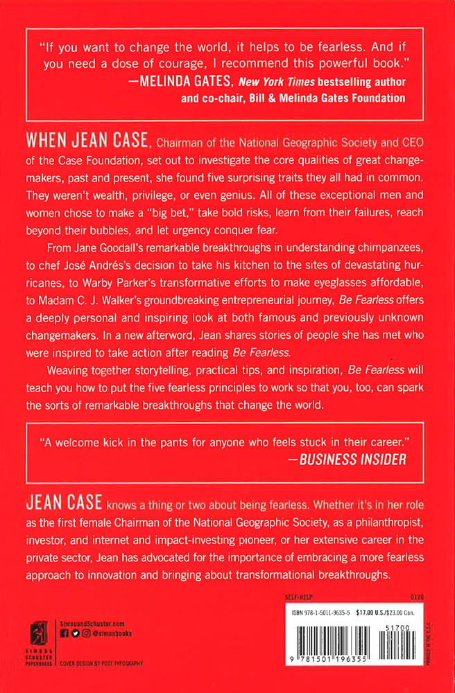 Weaving together storytelling, practical tips and inspiration, the book will teach you how to put the five fearless principles to work so that you too can spark the sorts of remarkable breakthroughs that can impact the world. Philanthropist, investor, and technology pioneer Jean Case brings to life the five Be Fearless principles common to the people and organizations that bring about transformational change.