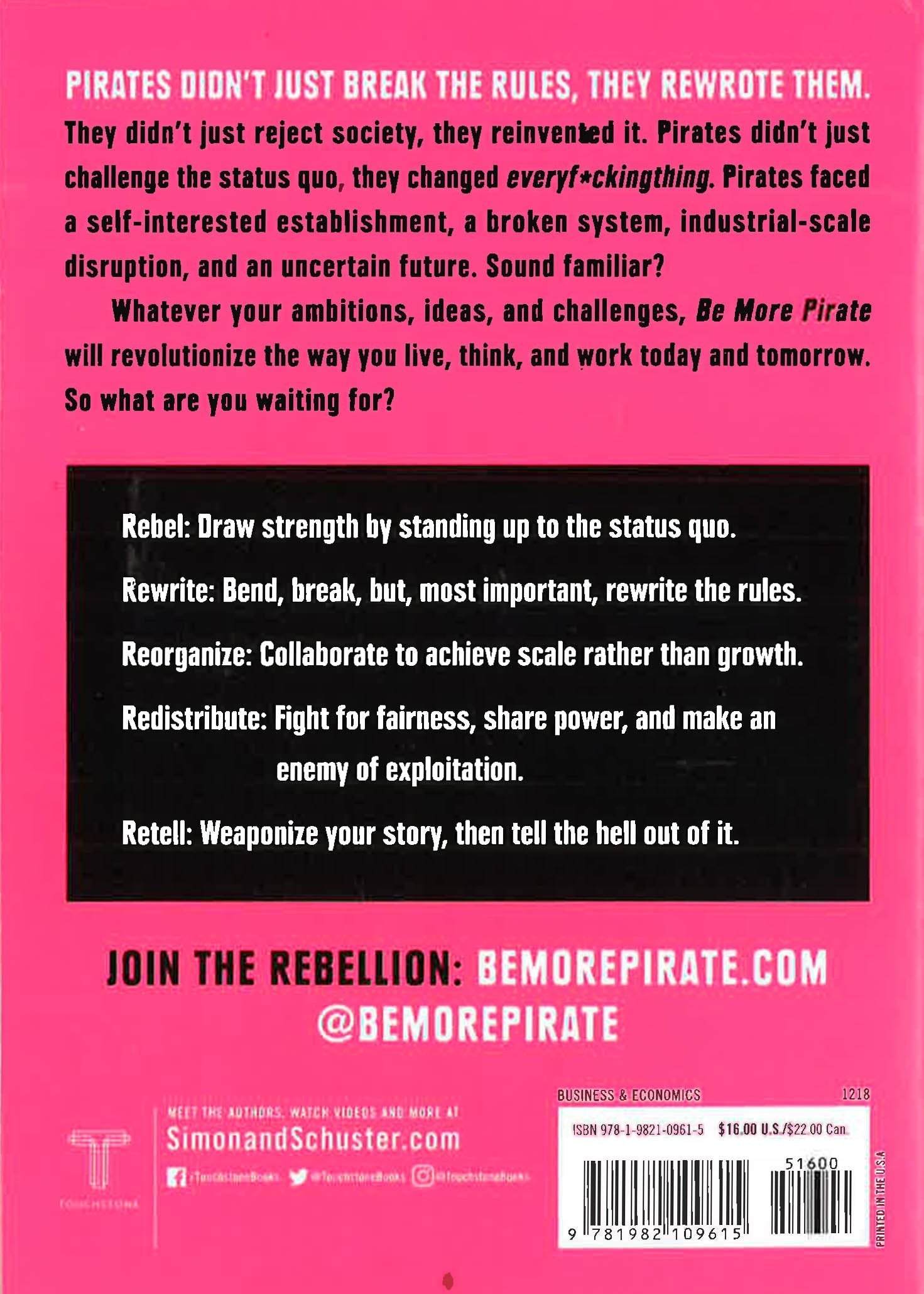 Pirates didn't just break the rules, they rewrote them. They didn't just reject society, they reinvented it. Pirates didn't just challenge the status-quo, they changed everyf*ckingthing. Pirates faced a self-interested establishment, a broken system, industrial scale disruption, and an uncertain future. Sound familiar? "I'd rather be a pirate than join the navy."--Steve Jobs Pirates stood for MISCHIEF, PURPOSE, and POWER. And you can too. Be More Pirate unveils the innovative strategies of Golden Age pirates, drawing parallels between the tactics and teachings of legends like Henry Morgan and Blackbeard with modern rebels, like Elon Musk, Malala, and Banksy. Featuring takeaway sections and a guide to building your own pirate code 2.0, Be More Pirate will show you how to leave your mark on the 21st century. 1. Rebel -- Draw strength by standing up to the status quo. 2. Rewrite -- Bend, break, but most importantly, rewrite the rules. 3. Reorganize -- Collaborate to achieve scale, rather than growth. 4. Redistribute -- Fight for fairness, share power, and make an enemy of exploitation. 5. Retell -- Weaponize your story, then tell the hell out of it. Whatever your ambitions, ideas and challenges, Be More Pirate will revolutionize the way you live, think, and work today, and tomorrow. So what are you waiting for? Join the rebellion.