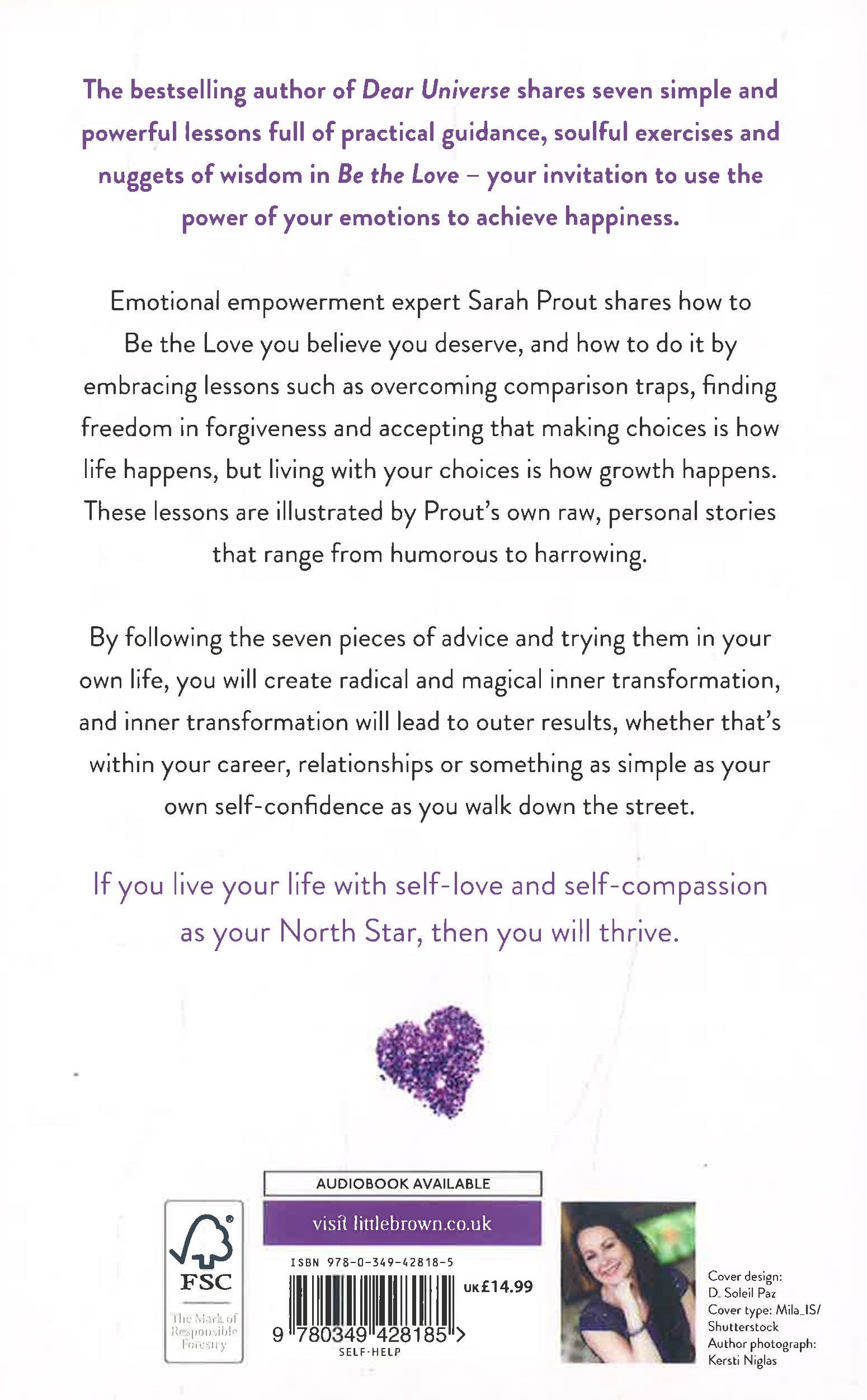 Emotional empowerment expert Sarah Prout shares how to Be the Love you believe you deserve, and how to do it by embracing lessons such as overcoming comparison traps, finding freedom in forgiveness and accepting that making choices is how life happens, but living with your choices is how growth happens. These lessons are illustrated by Prout's own raw, personal stories that range from humorous to harrowing.