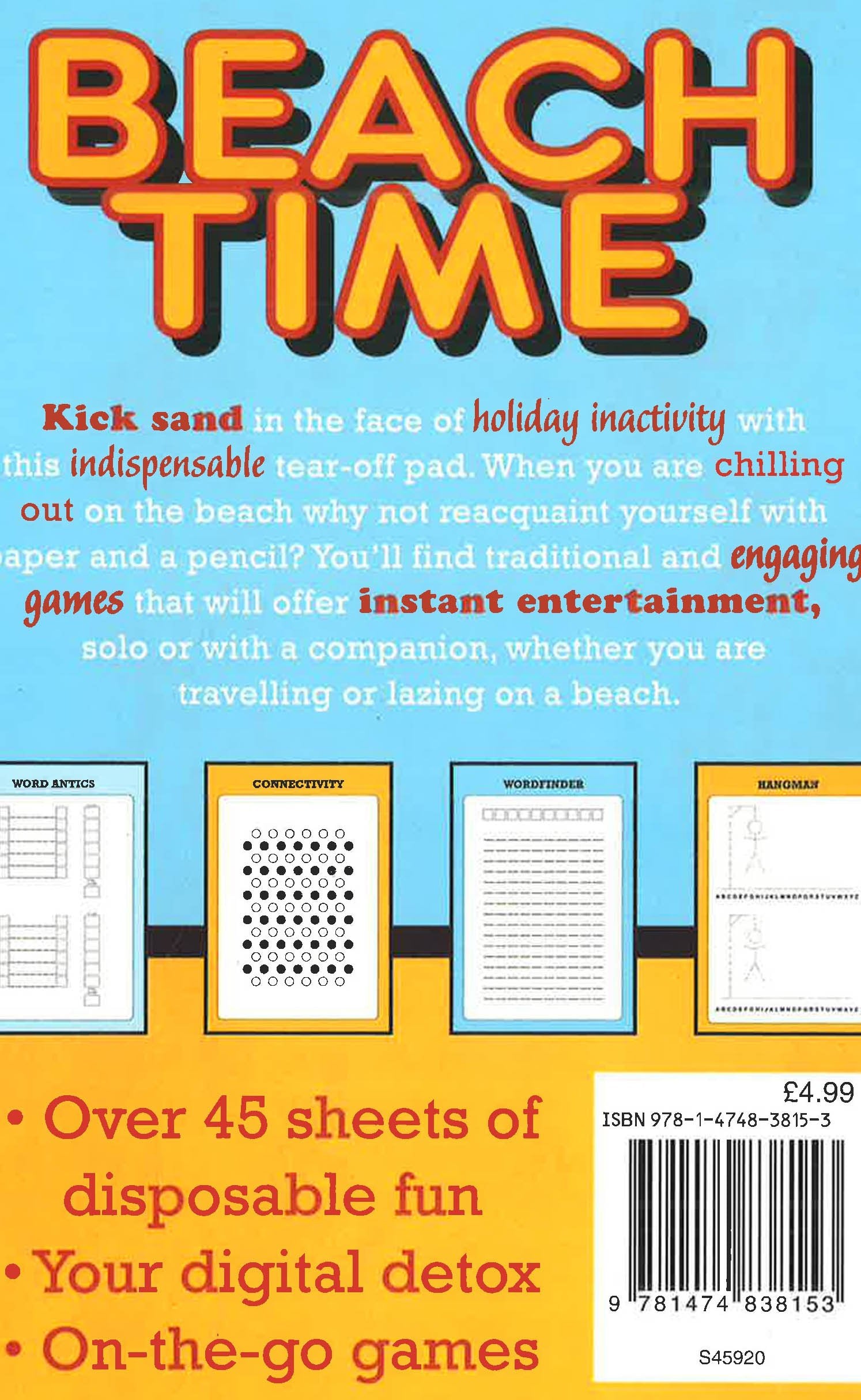 Would you like some gentle, entertaining holiday activities? Something to keep your brain active when you're relaxing on the beach? Then embrace the delights of an older form of entertainment: pen and paper games, activities that don't require any batteries and don't involve screens. Traditional games with paper are invaluable when you're enjoying a refreshing summer drink with a friend or wanting some distraction as you relax on the beach - the four types of games in the Beach Time Game Pad are Word Antics, Connectivity, Wordfinder and Hangman, providing over 45 sheets of disposable fun.
