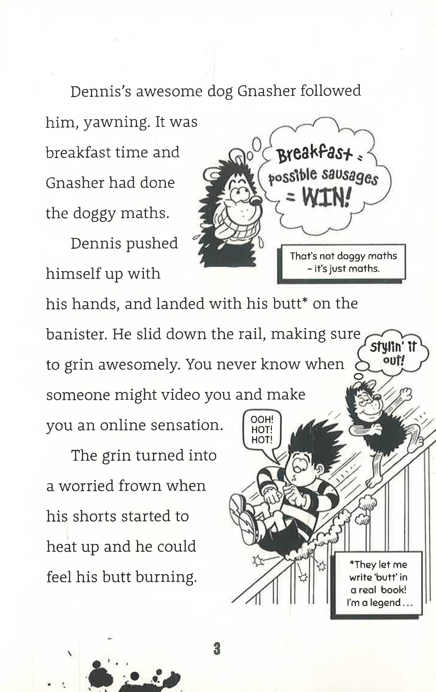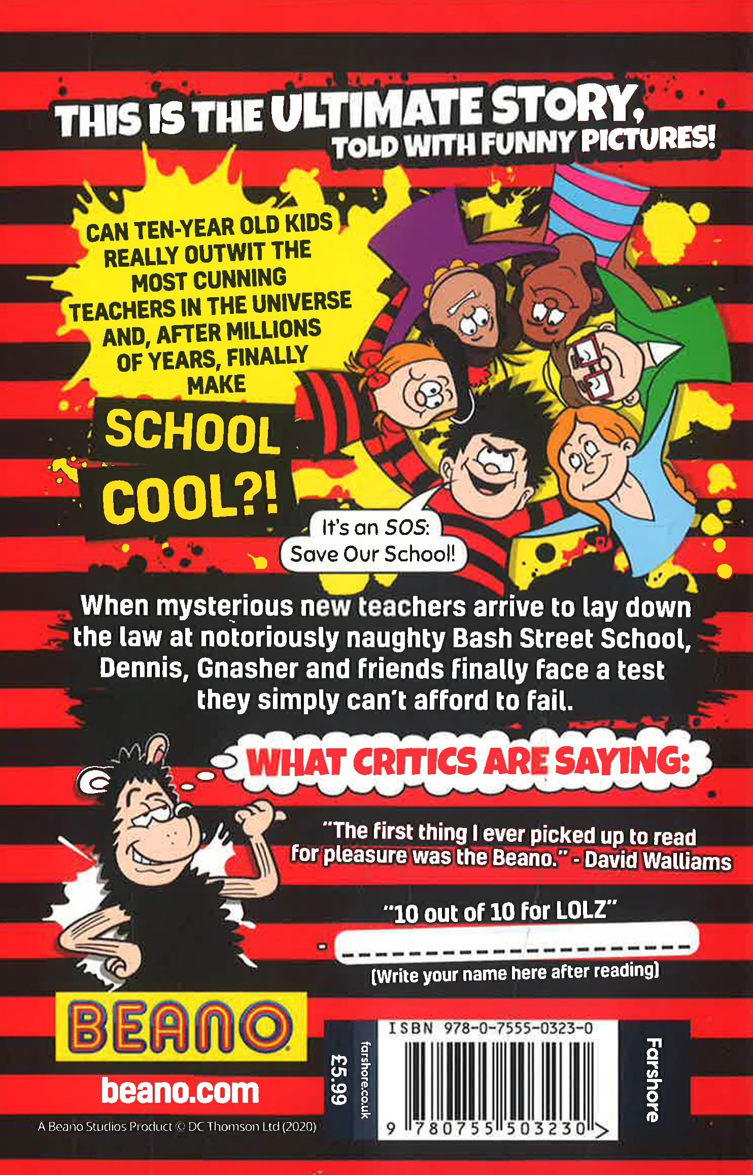 Can a group of ten year old mates (and one scruffy dog) really outwit the most fiendish, cunning teachers in the universe and, after millions of years, finally make school cool?! When mysterious new teachers arrive to lay down the law at notoriously naughty Bash Street School, Dennis, Gnasher and friends finally face a classroom test they simply can't afford to fail ... Dennis and Gnasher are back for another adventure. An adventure story, told with funny pictures ...