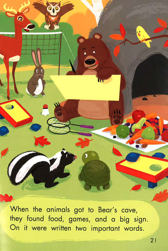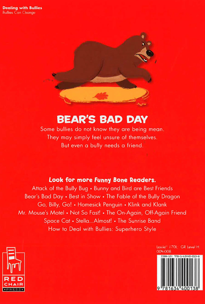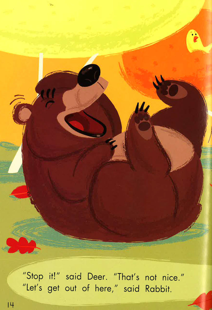 Bear lived in a cave all alone, but when he goes out in the forest to find friends, he is gruff and offends everyone he meets. Until Bird points out that he's being a bully. Bear thinks about his actions and realizes it was his own way of trying to keep from being hurt by rejection. After he apologizes, he has plenty of new friends who flock to the big loveable bear.