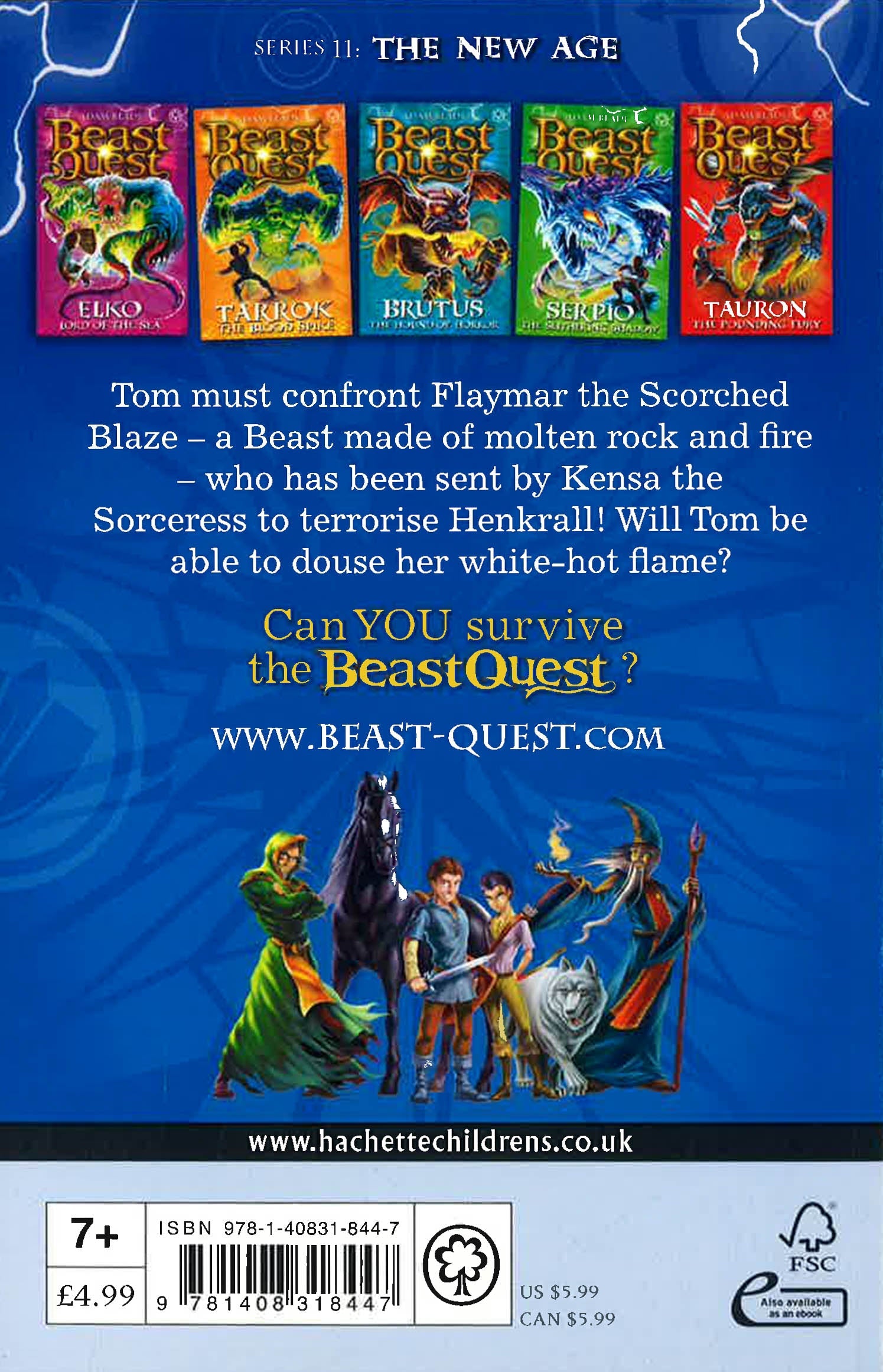 Battle fearsome beasts and fight evil with Tom and Elenna in the bestselling adventure series for boys and girls aged 7 and up.Tom must confront Flaymar the Scorched Blaze - Kensa the Sorceress's fiery Evil Beast - sent to terrorise the land! Can the Avantian hero overcome her fearsome heat and douse her flames?There are SIX thrilling adventures to collect in the Beast Quest: The New Age series: Elko Lord of the Sea; Tarrok the Blood Spike; Brutus the Hound of Horror; Flaymar the Scorched Blaze; Serpio the Slithering Shadow; Tauron the Pounding Fury.If you like Beast Quest, check out Adam Blade's other series: Team Hero, Sea Quest and Beast Quest: New Blood!