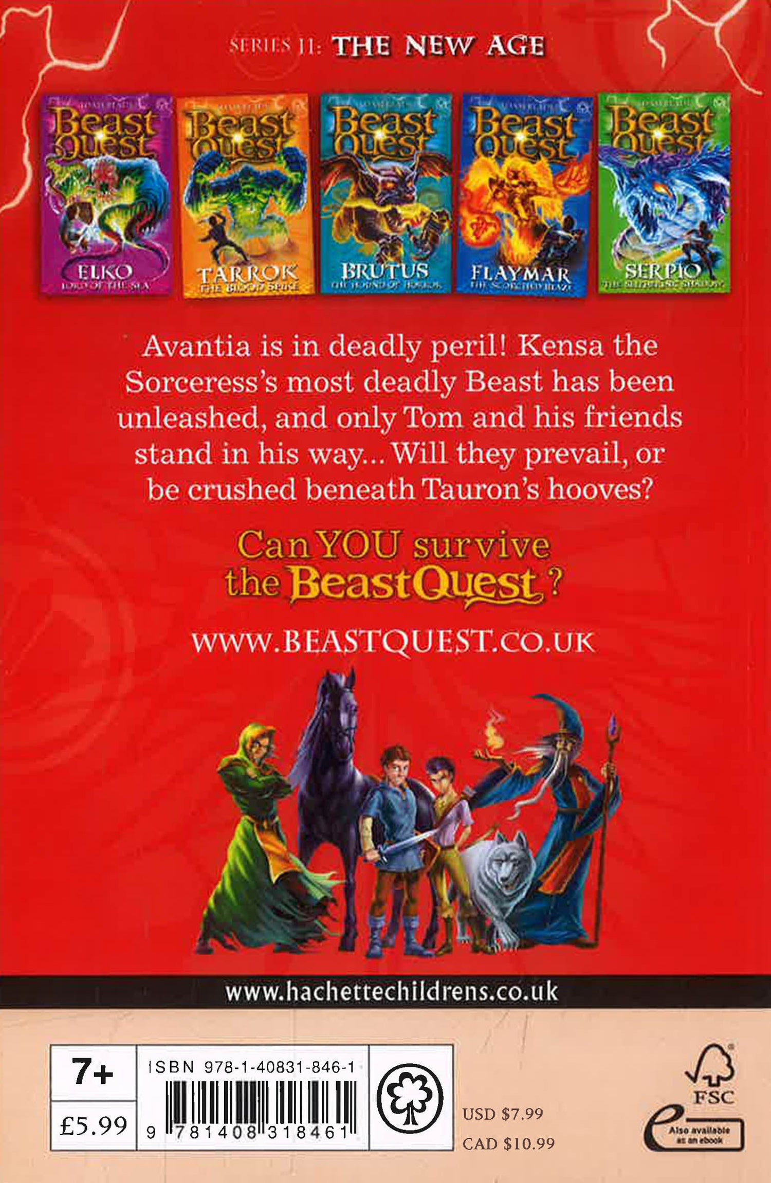 There are SIX thrilling adventures to collect in the Beast Quest: The New Age series: Elko Lord of the Sea; Tarrok the Blood Spike; Brutus the Hound of Horror; Flaymar the Scorched Blaze; Serpio the Slithering Shadow; Tauron the Pounding Fury.