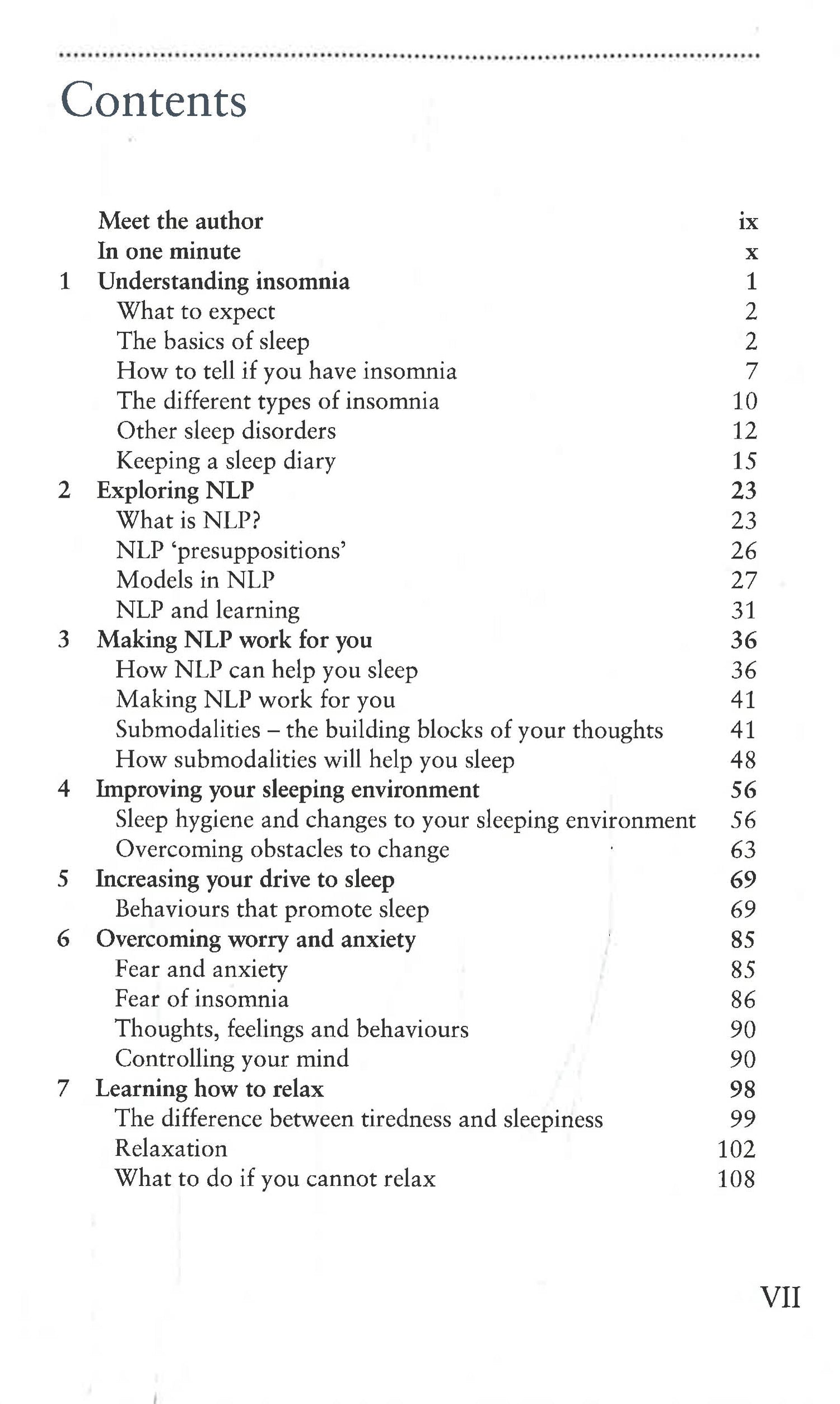 This book is full of practical, NLP-based guidance, which will help everyone from serious sufferers to people who have the occasional problems. These NLP techniques, combined with the friendly and straightforward approach of Teach Yourself, could hold the answer to your sleep problems.