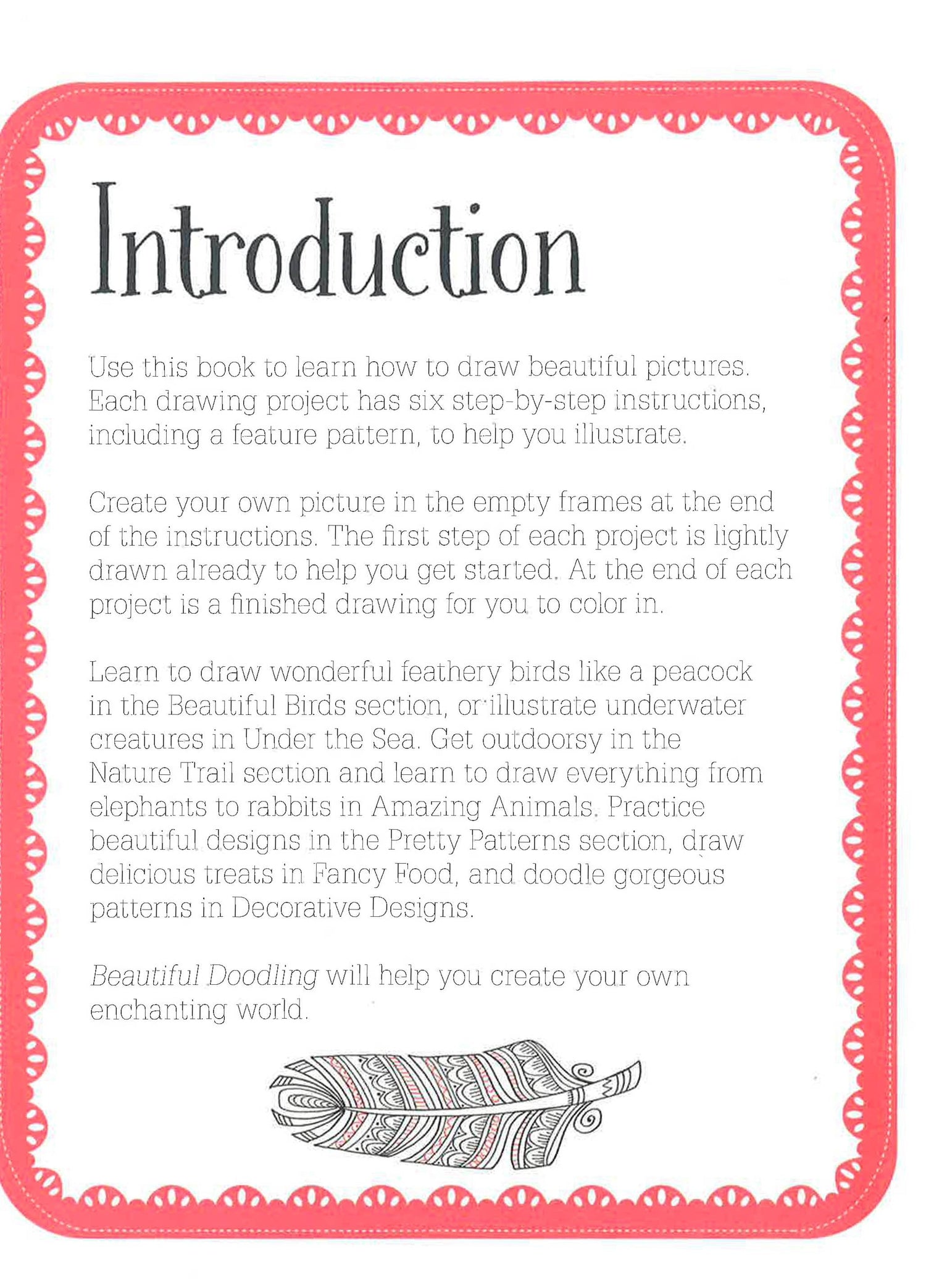 With it's half-drawing/half-coloring book format, Beautiful Doodling that teaches kids to illustrate intricate and beautiful animals and objects. Each project contains a "feature design" and space for kids to practice the design pattern and the image. Every project is simplified with six easy step-by-step instructions. At the end, kids can color in the designs-which include fancy peacocks, yummy cupcakes, beautiful Russian dolls, and more.