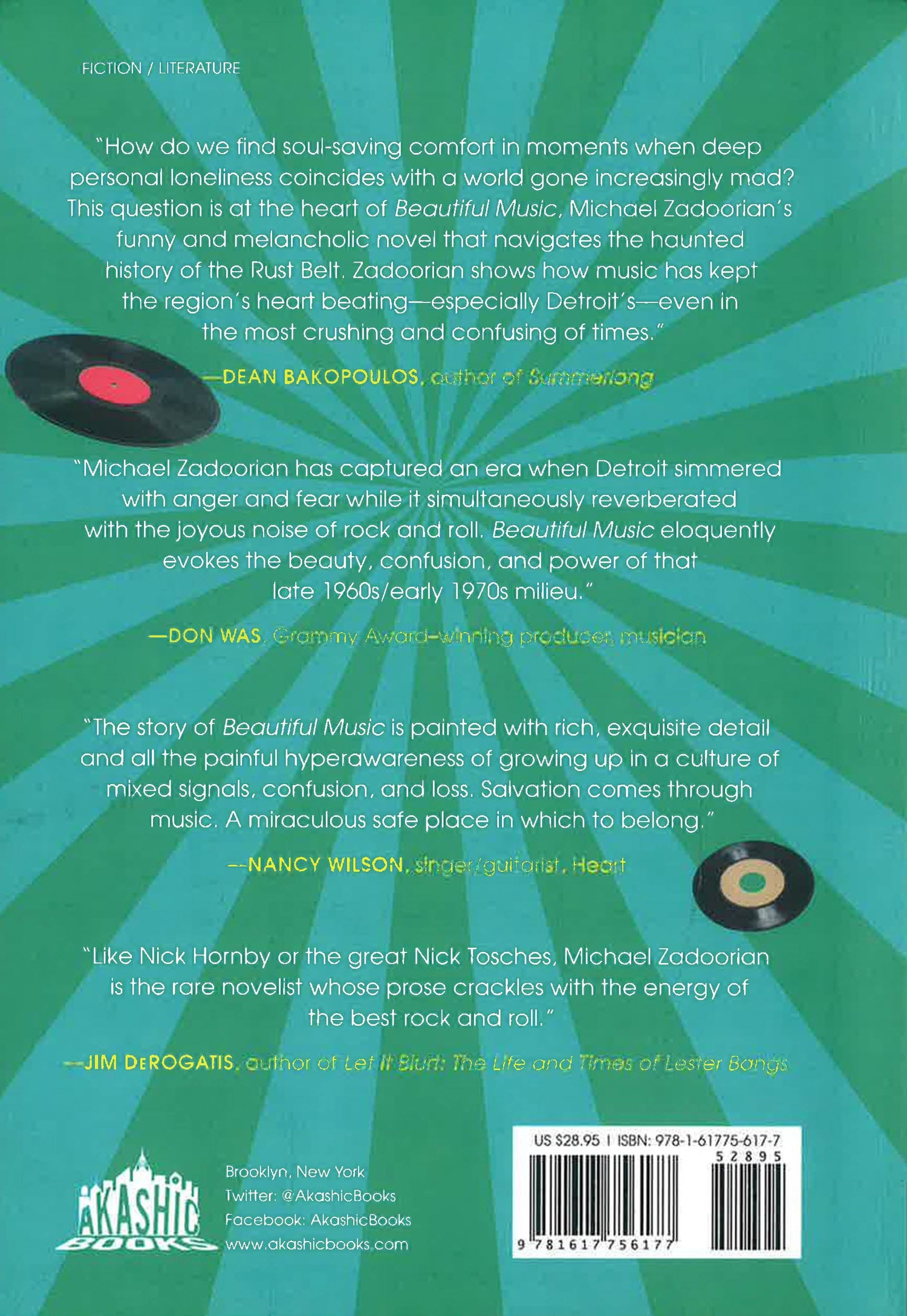 But after tragedy strikes the family, Danny's mother becomes increasingly erratic and angry about the seismic cultural shifts unfolding in her city and the world. As she tries to hold it together with the help of Librium, highballs, and breakfast cereal, Danny finds his own reason to carry on: rock and roll. In particular, the drum and guitar-heavy songs of local legends like the MC5 and Iggy Pop. In the vein of Nick Hornby and Tobias Wolff, yet with a style very much Zadoorian's own, Beautiful Music is a touching story about the power of music and its ability to save one's soul.