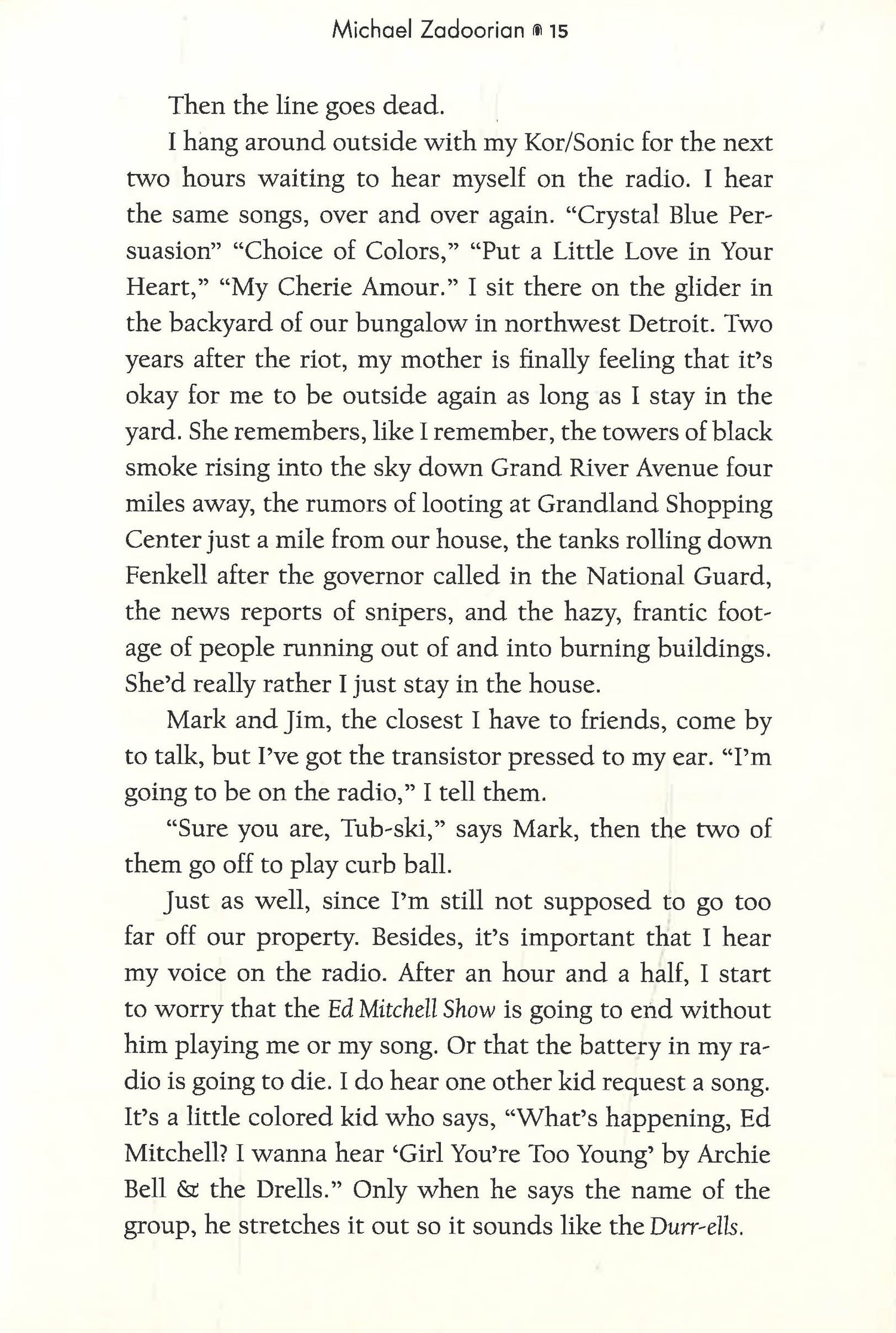 "Zadoorian takes us back to Detroit in the 1970s, which was still throbbing from the 1967 rebellion, and was in the throes of the energy crisis and the sexual revolution. Protagonist Danny Yzemski finds that growing up in such times can be...complicated. But with a little help from Iggy Pop, the MC5, and Led Zeppelin, he finds just the boost he needs to survive--and even grow a bit."