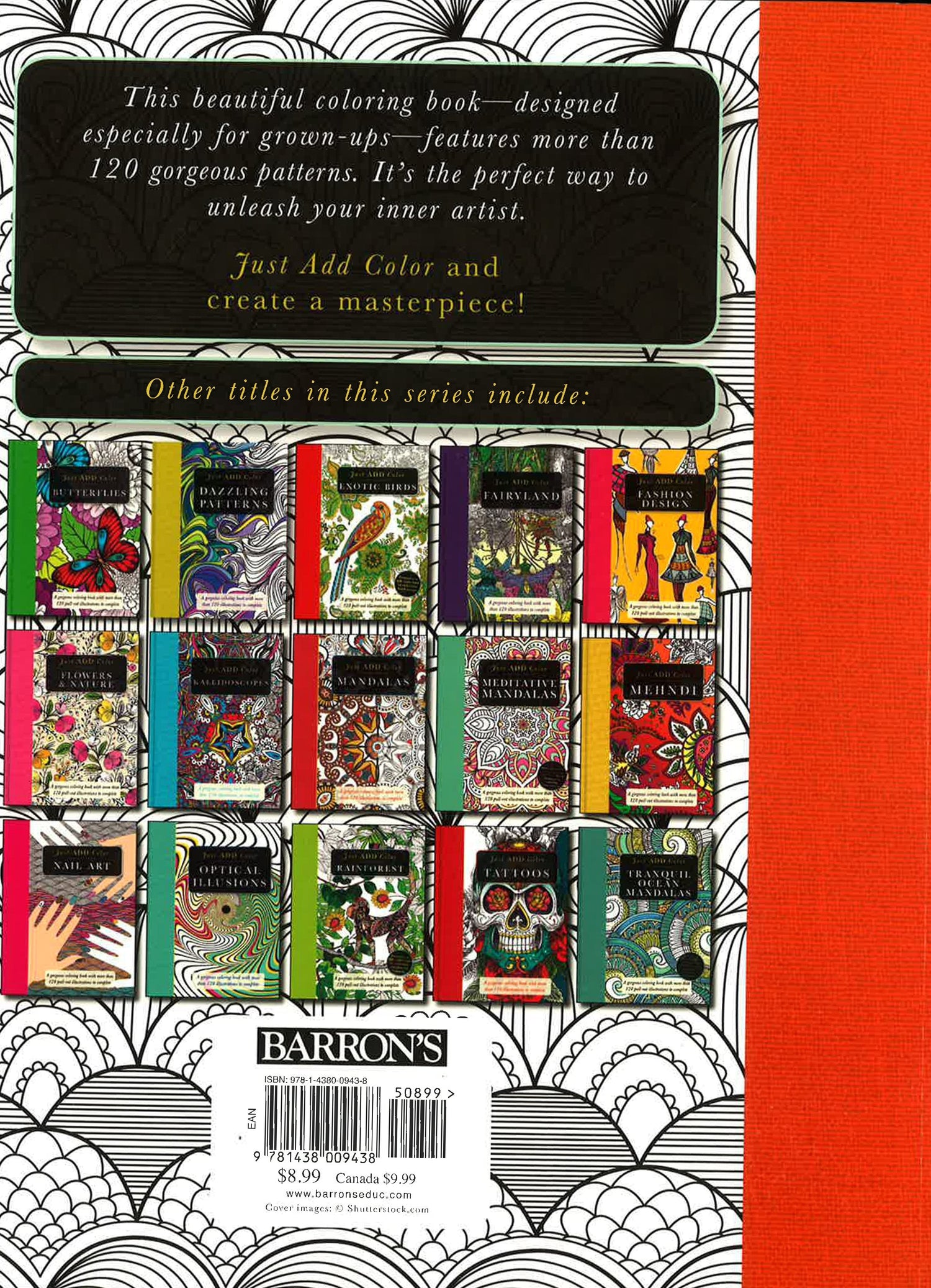 Here's a new and exciting addition to the best-selling Just Add Color series! Mindfulness, wellness, enhanced creativity, and stress-busting are just some of the benefits attributed to adult coloring books. It's no wonder that coloring has taken its place at the grown up's table as a legitimate form of artistic expression, right along with painting and drawing. Plus, it's just so much fun! In Beautiful Patterns, you'll find 120 pull-out illustrations of everything from swirling lines, splashes of waves and 3D geometric patterns to spirals, tiles, and bubbles to color and complete. Just Add Color and you'll be so entranced, you'll run for your crayons or coloring pencils as often as you can. Includes a QR code link to relaxing ambient music.