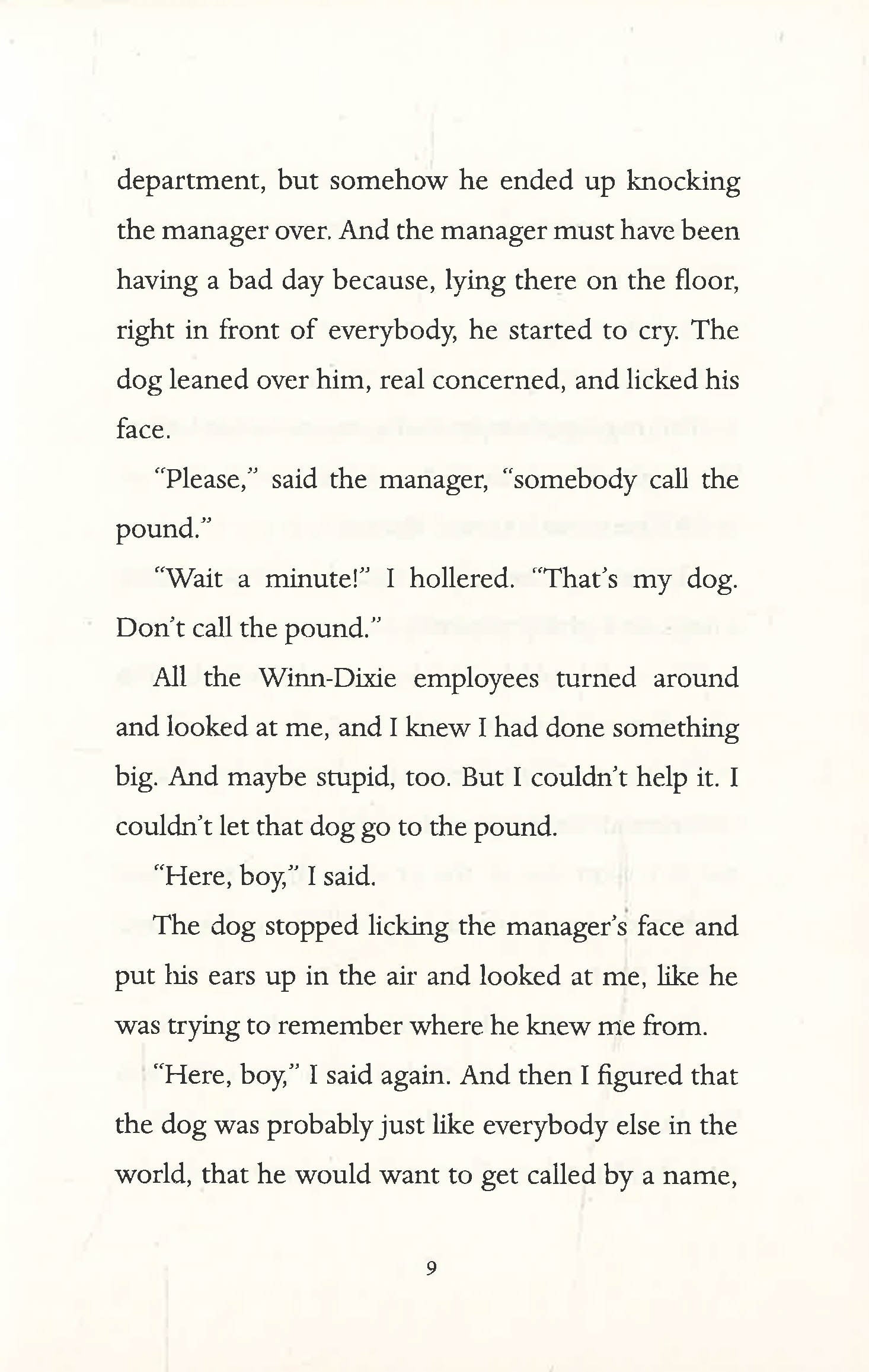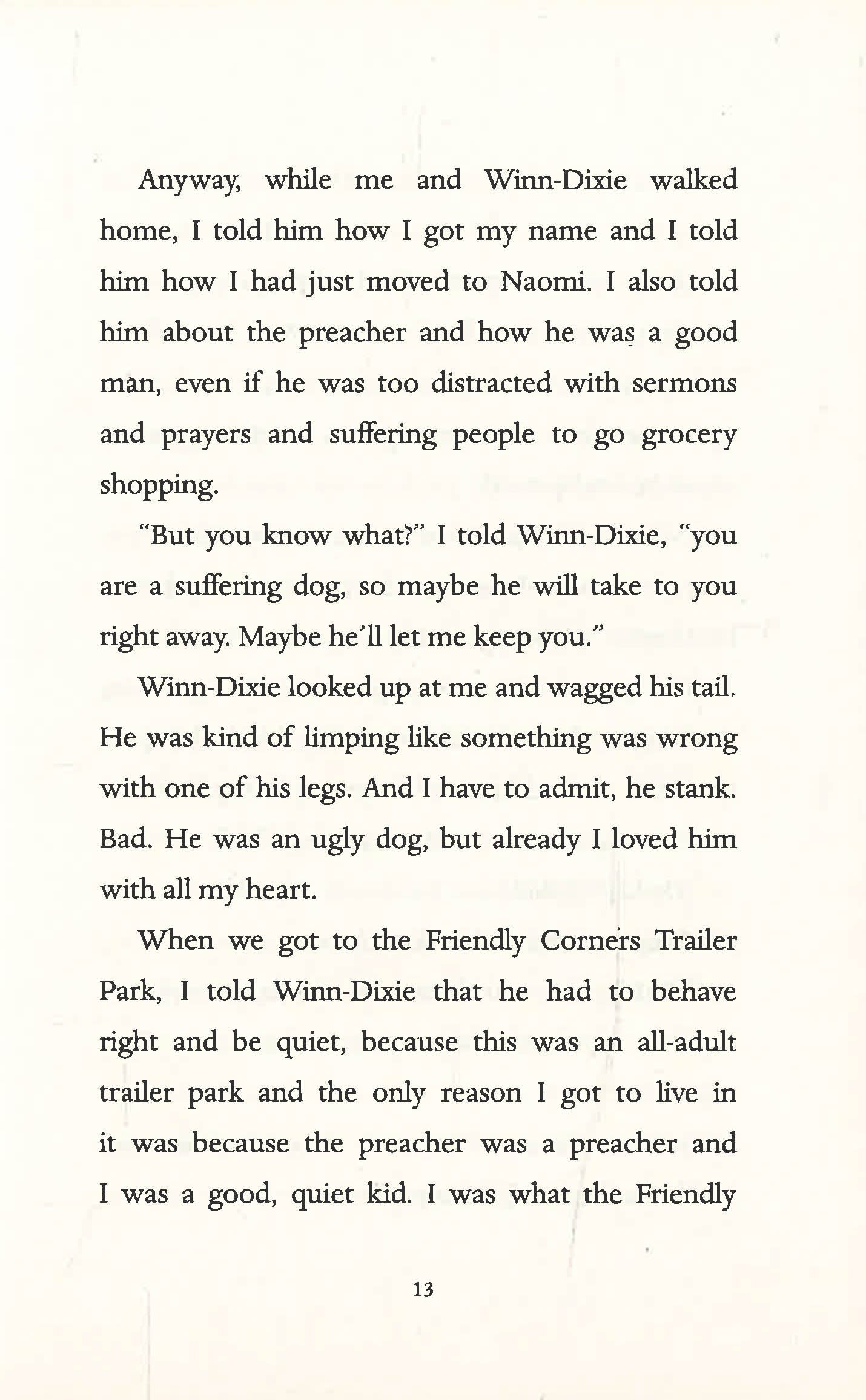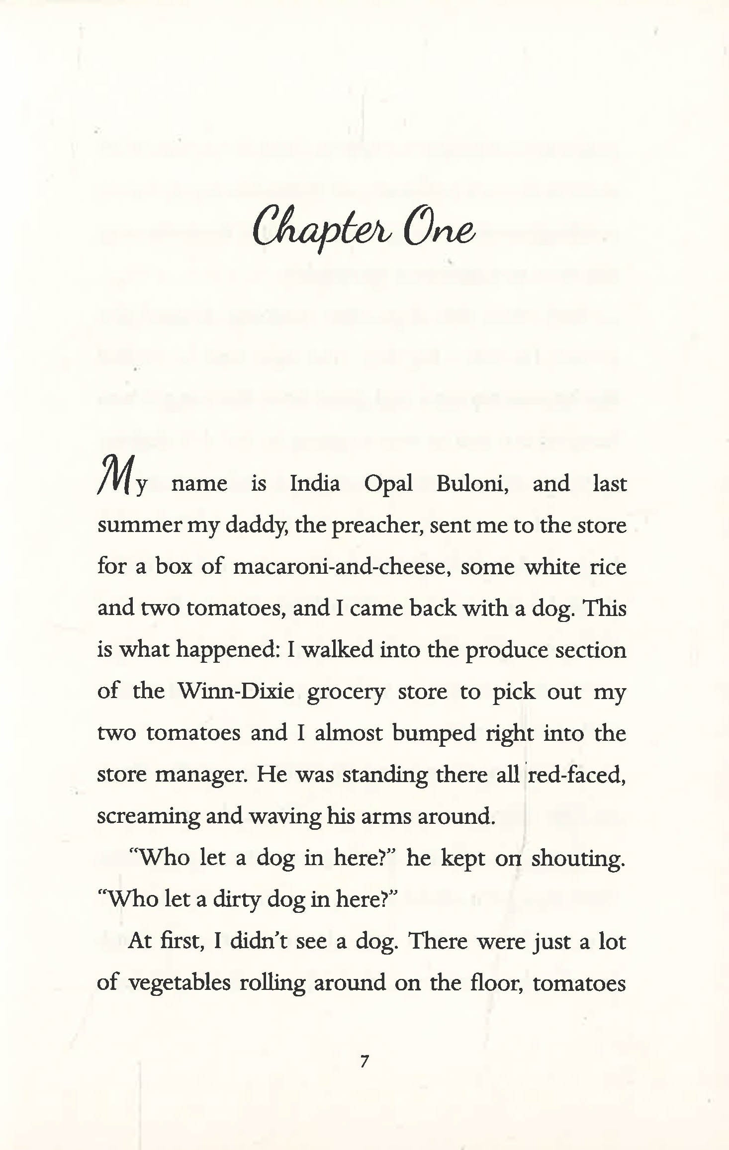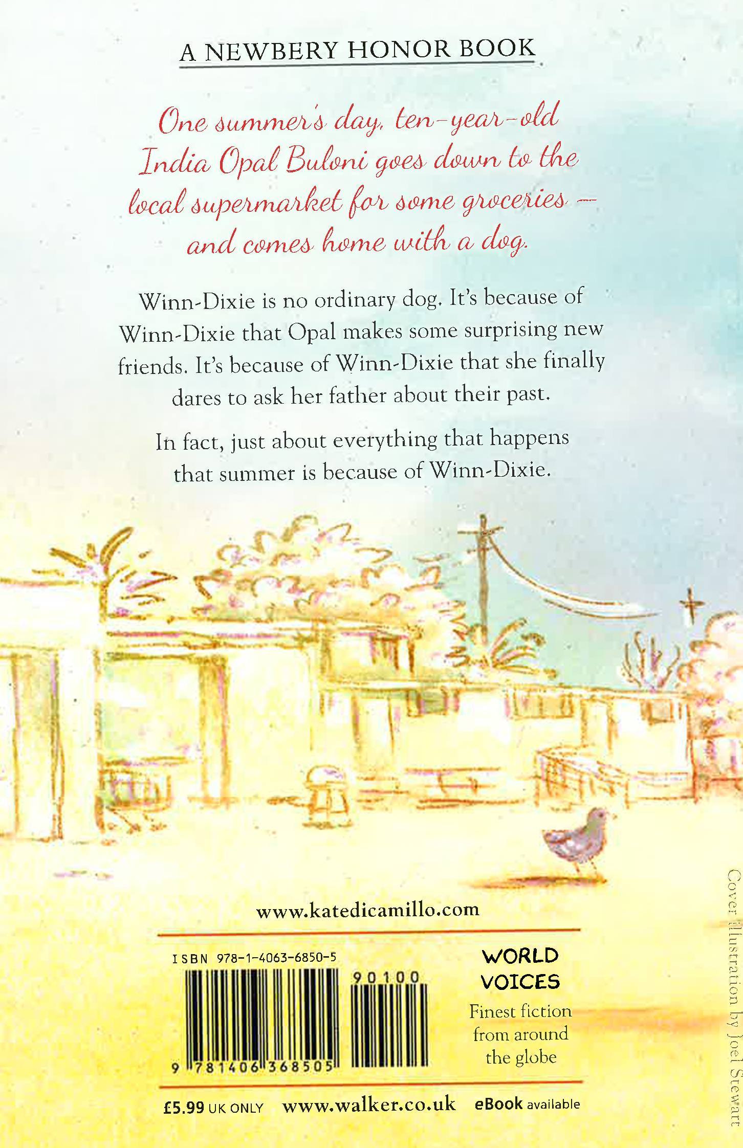 This novel captures life in a quirky Southern town as Opal and her mangy dog, Winn-Dixie, strike up friendships among the locals. One summer's day, ten-year-old India Opal Buloni goes down to the local supermarket for some groceries - and comes home with a dog. But Winn-Dixie is no ordinary dog. It's because of Winn-Dixie that Opal begins to make friends. And it's because of Winn-Dixie that she finally dares to ask her father about her mother, who left when Opal was three. In fact, as Opal admits, just about everything that happens that summer is because of Winn-Dixie. This is a critically acclaimed novel from No. 1 New York Times Bestseller and Newbery Award Winner Kate DiCamillo. It is an international bestseller, now available in over 30 languages!